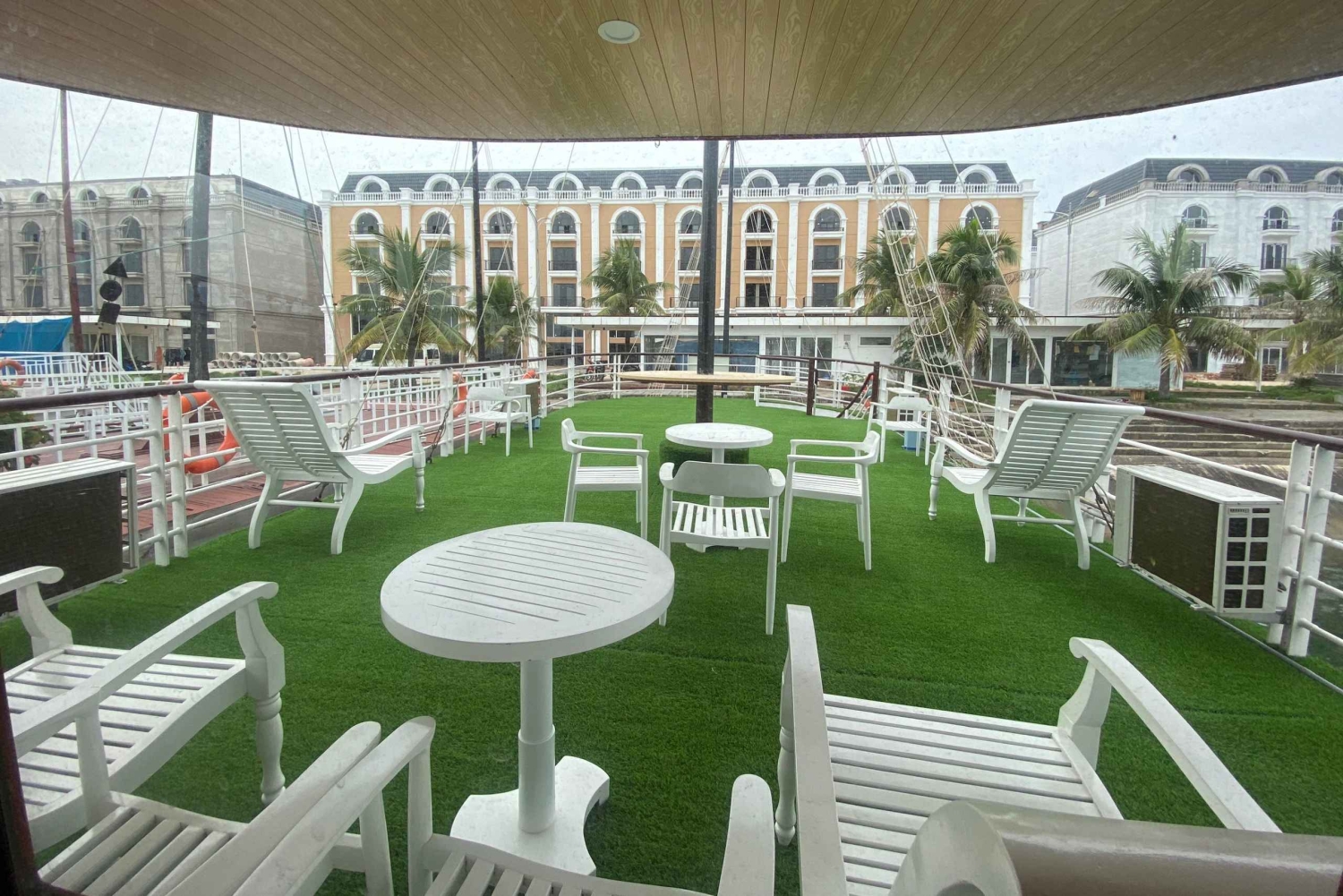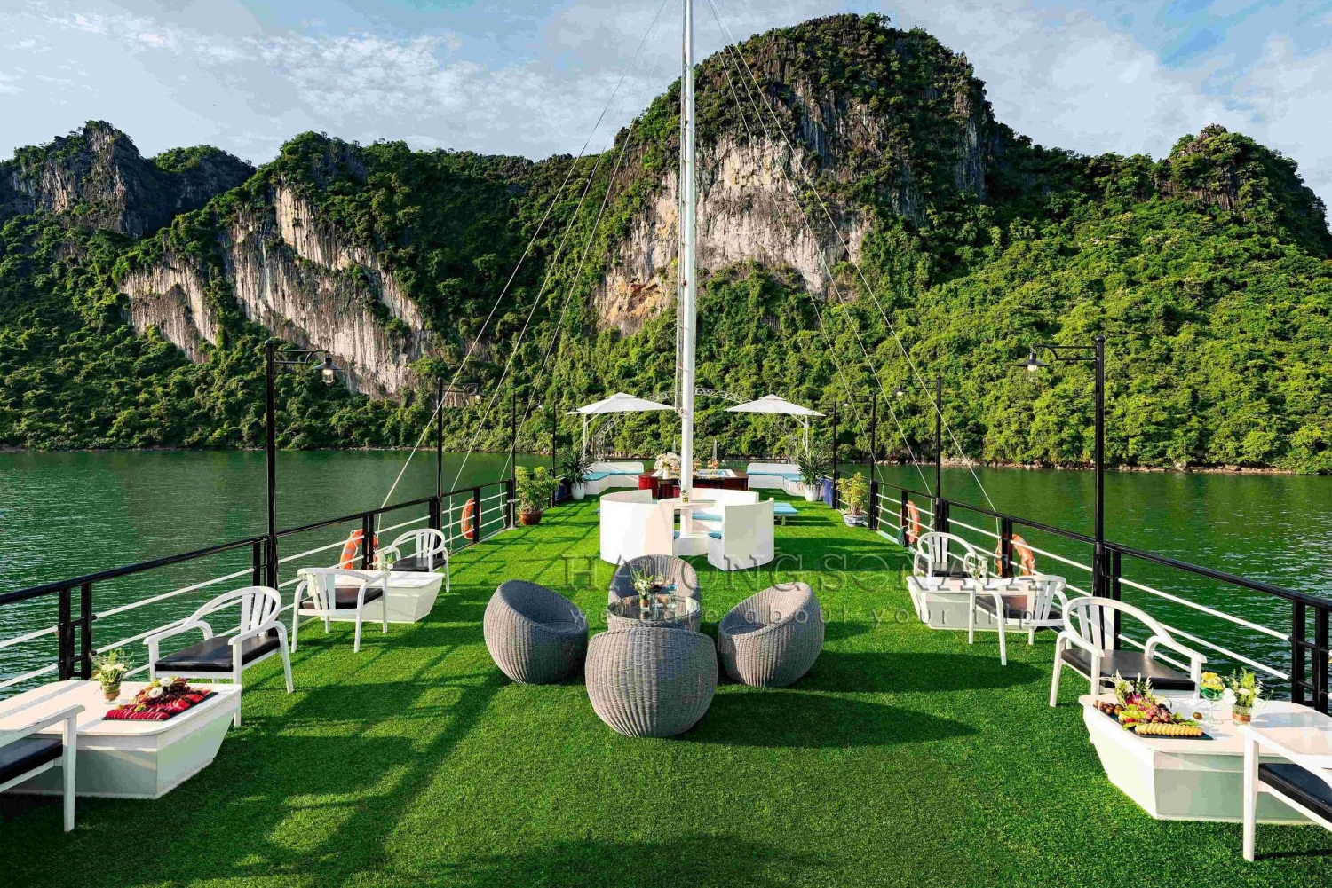 Omkring kl. 12.00: Ankomst til Tuan Chau Island med venteværelse, velkomst ombord, sikkerhedsbriefing af turguide og start på 5-timers krydstogt på den legendariske Halong Bay.