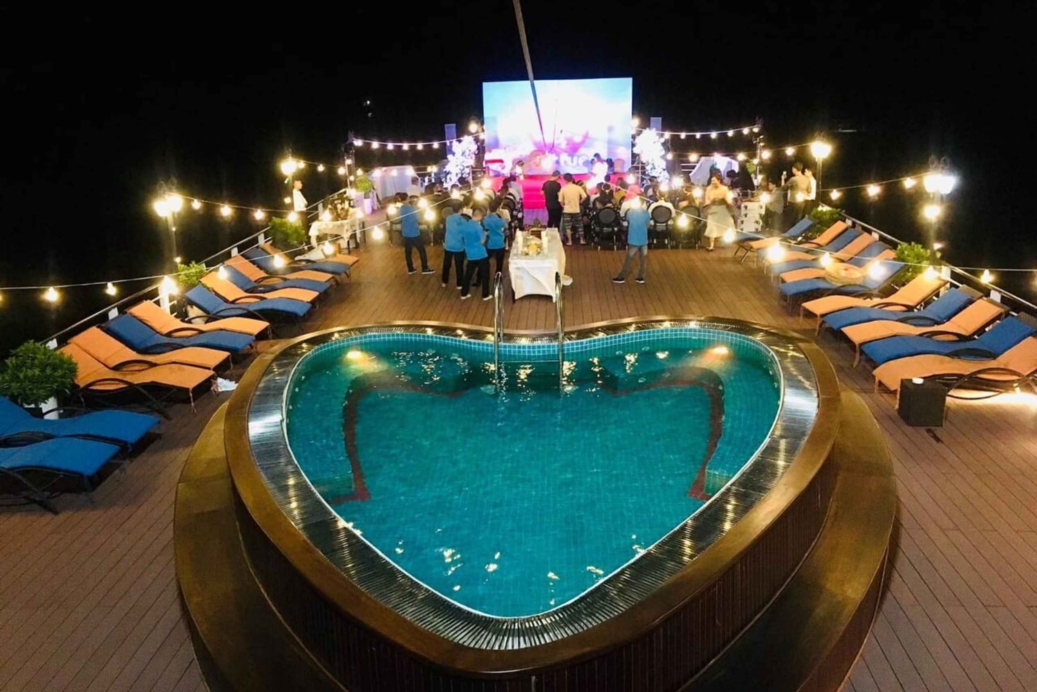 17.30-18.30: Sunset Party og Happy Hour er det ideelle tidspunkt til at nyde en kop varm te, mens du ser solnedgangen over bugten, eller du kan slappe af i jacuzzien på soldækket, solbade og frit besøge og tage billeder. Gæsterne har især mulighed for at deltage i Happy Hour-programmet 'Køb 2 drikkevarer, få 1 drikkevare gratis' i baren.
