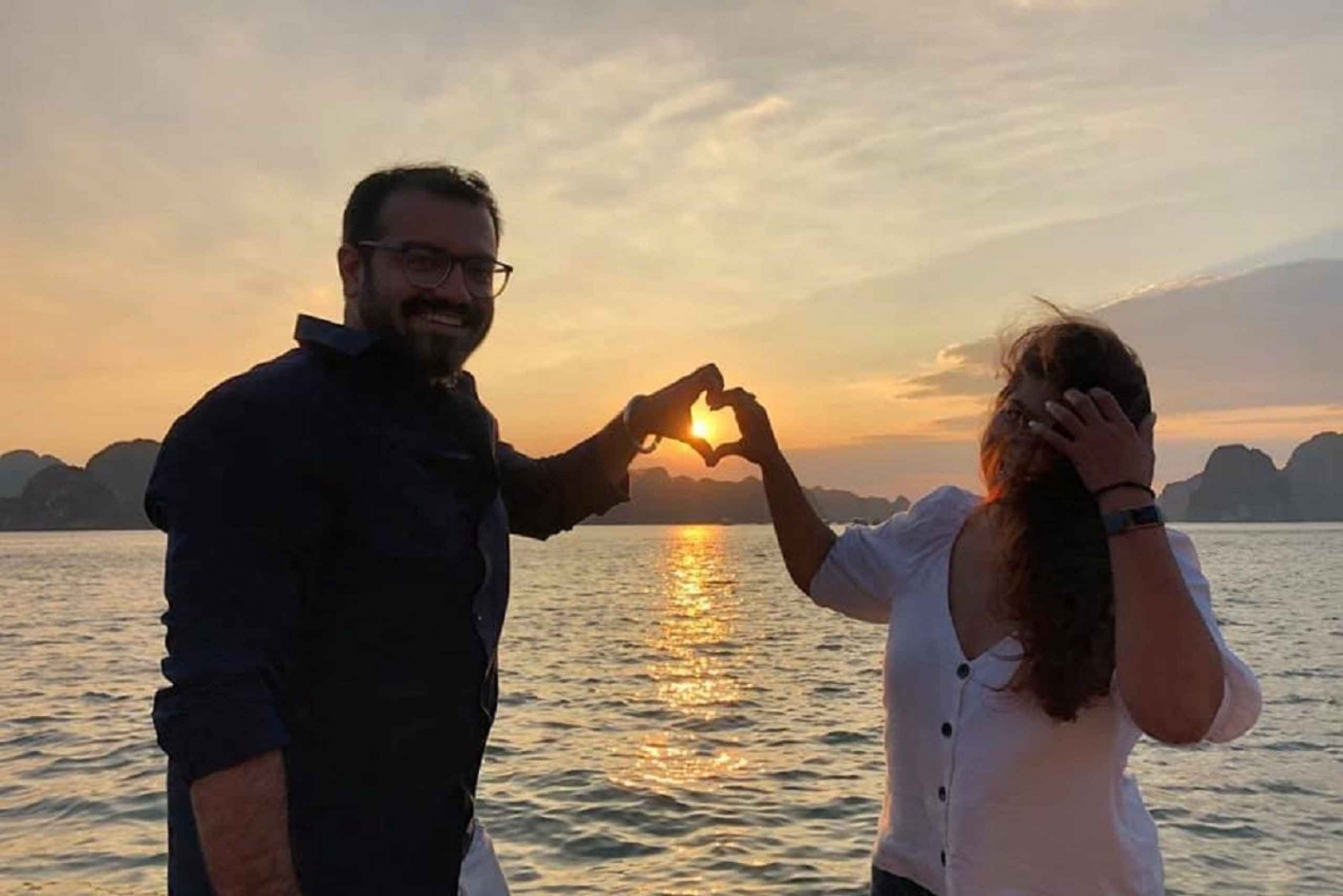 ✓ Tilbage til dagsbåden for en lækker frokost ved middagstid. Brug mere tid på at sejle i kajak eller svømme ved Cong Dam eller slappe af på båden. Hvis vejret tillader det, kan vi tage et kig på Thay Cave, før vi vender tilbage til hovedskibet og nyder solnedgangsfesten bagefter. Spis middag, og få derefter tid til at deltage i spil. Du kan også prøve lykken med blækspruttefiskeri.