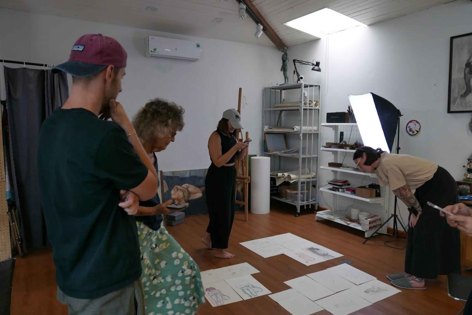 Vores atelier ligger i Tây Hồ – kun 20 minutter fra det gamle kvarter – og tilbyder en begyndervenlig session med at tegne fra en levende model, der ledes af en akademisk kunstinstruktør.