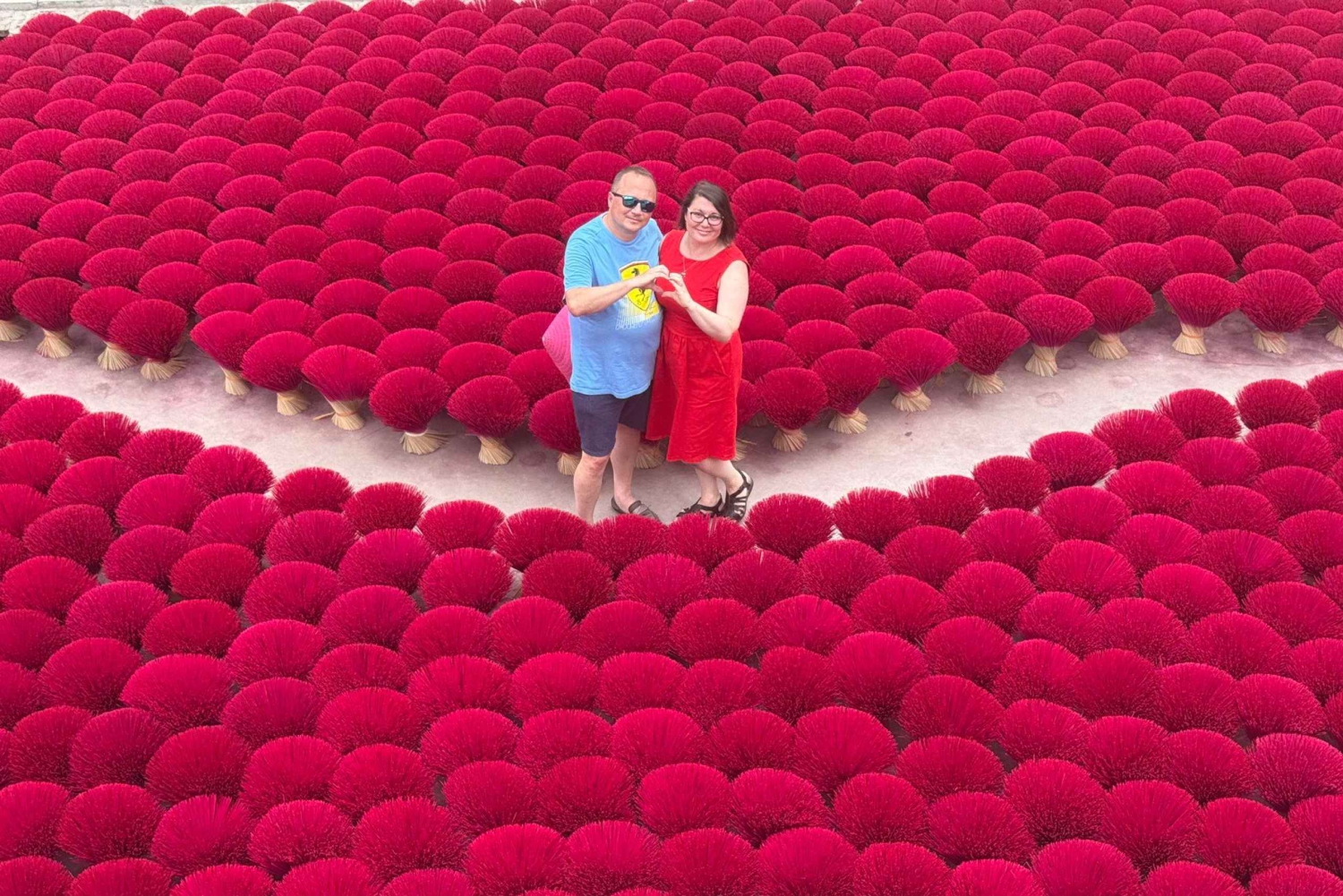 Begynd din rejse i Vietnams mest fotogene landsby, hvor tusindvis af håndlavede røgelsebunke blomstrer som blomster. Besøg en lokal håndværkerfamilie, hvis hemmeligheder om røgelse er blevet videregivet i over 100 år. Lær den sarte farvningsproces, håndrul din egen røgelse, og tag levende billeder af dette enestående landskab.
