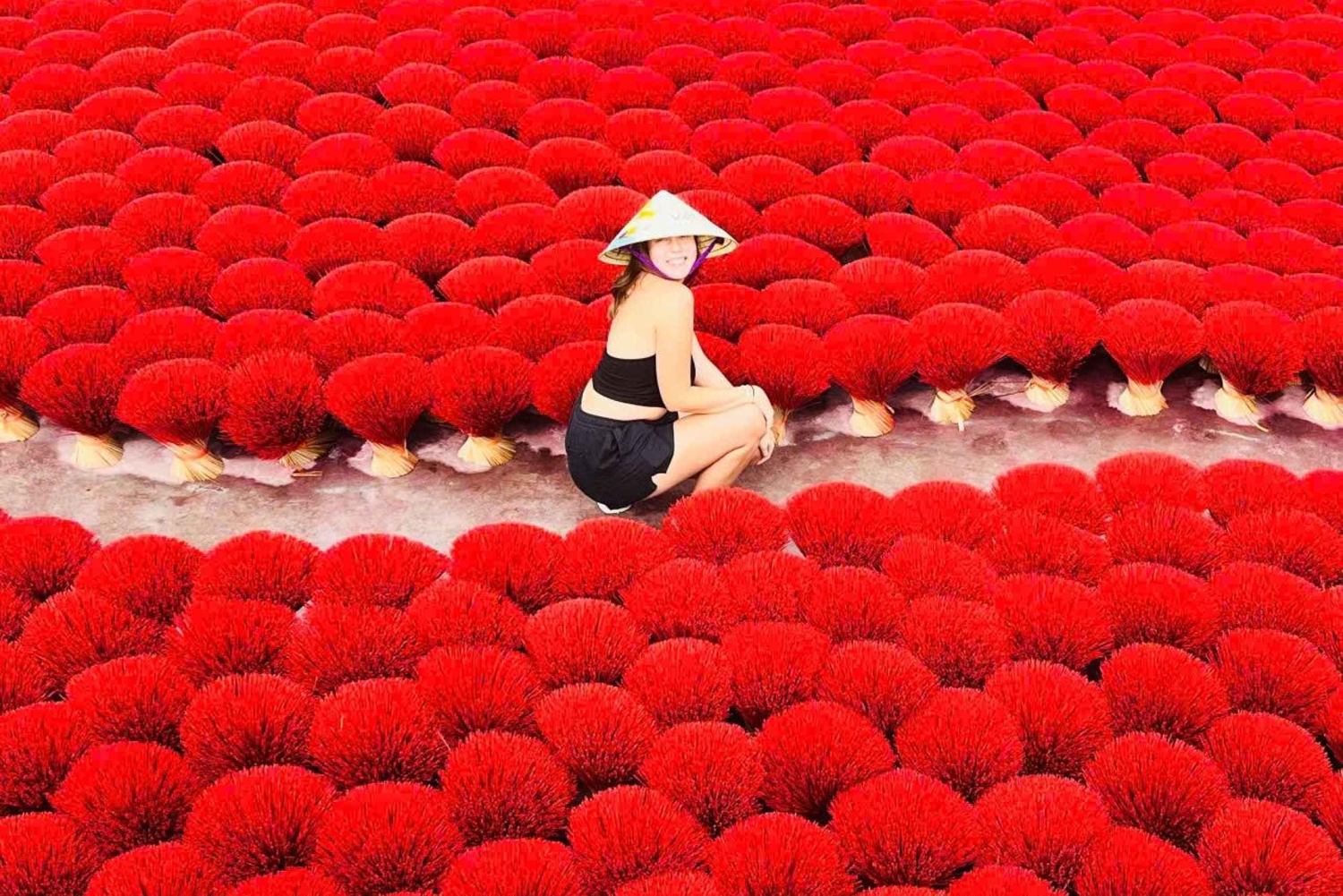Tag til landsbyen Quang Phu Cau, som har produceret røgelse i mere end 100 år. Gå en tur til landsbyens centrum, og se, hvordan de lokale laver røgelse i familiens håndværksproduktion. Mød en familie, der har specialiseret sig i at farve røgelsepinde, og nyd de farverige bundter af røgelse.