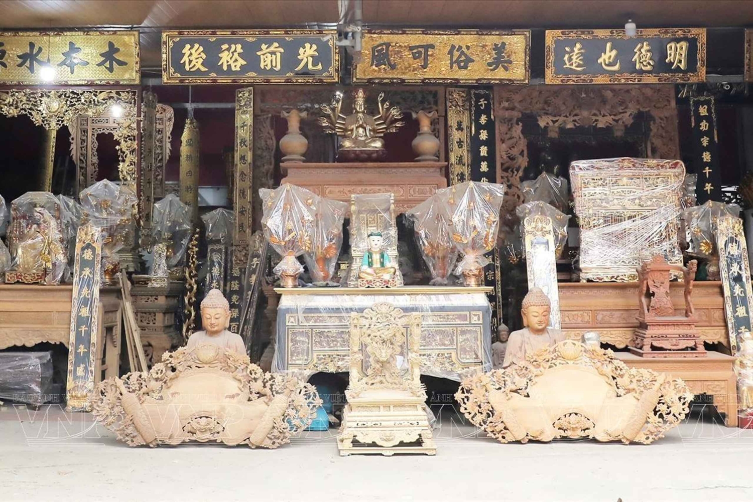 Udforsk et showroom i Son Dong-landsbyen, hvor du kan se de færdige produkter, fra Buddha-statuer til udskårne paneler, der hver især legemliggør åndelig hengivenhed og essensen af vietnamesisk kultur og kunst.