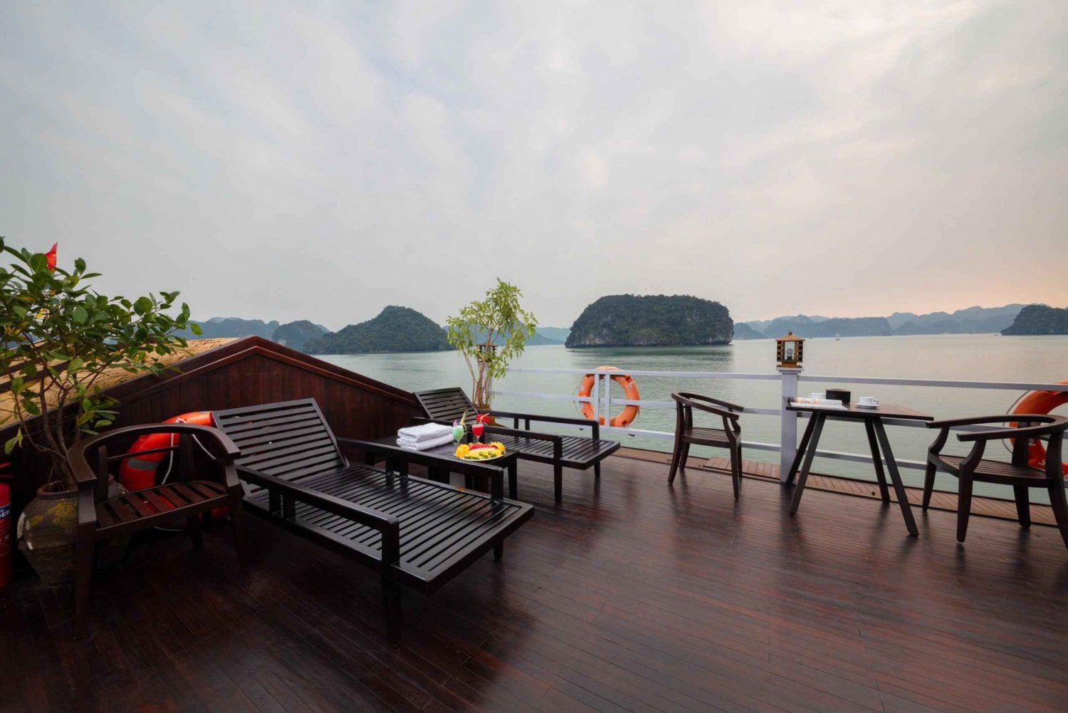 Wache früh auf, um den Sonnenaufgang vom Sonnendeck aus zu beobachten. Genieße den Morgentee oder Kaffee und das Frühstück. Besuche eine bekannte Perlenfarm, um mehr über den Prozess der Perlenzucht zu erfahren. Erkunde die Ha Long Bucht mit dem Kajak in deinem eigenen Tempo.