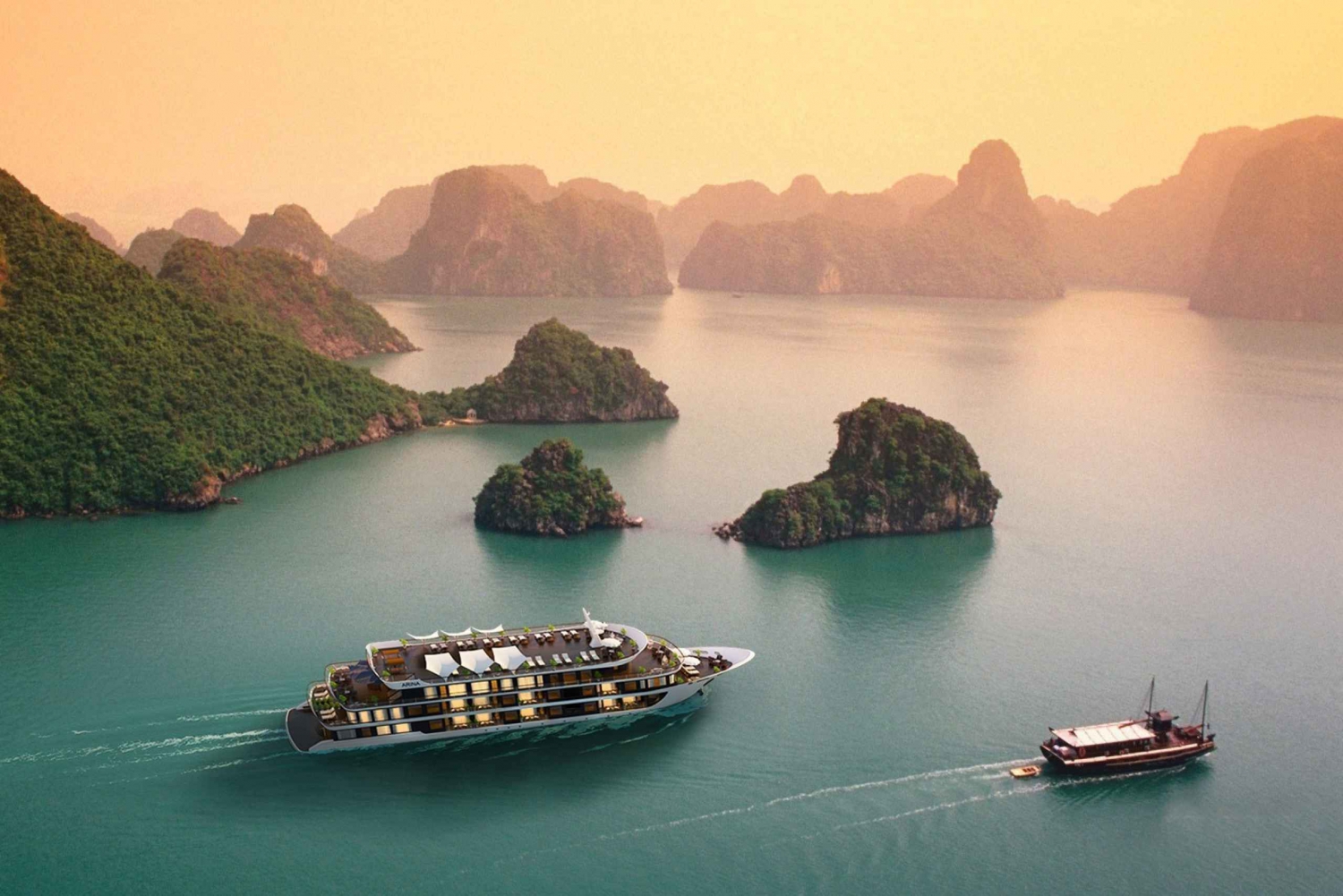 Erlebe eine luxuriöse 6-Sterne-Kreuzfahrt durch die Halong- und Lan Ha-Bucht. Balkonkabine, Gourmet-Restaurant, Infinity-Pool, Spa, Panorama-Sky-Bar, Sonnendeck.