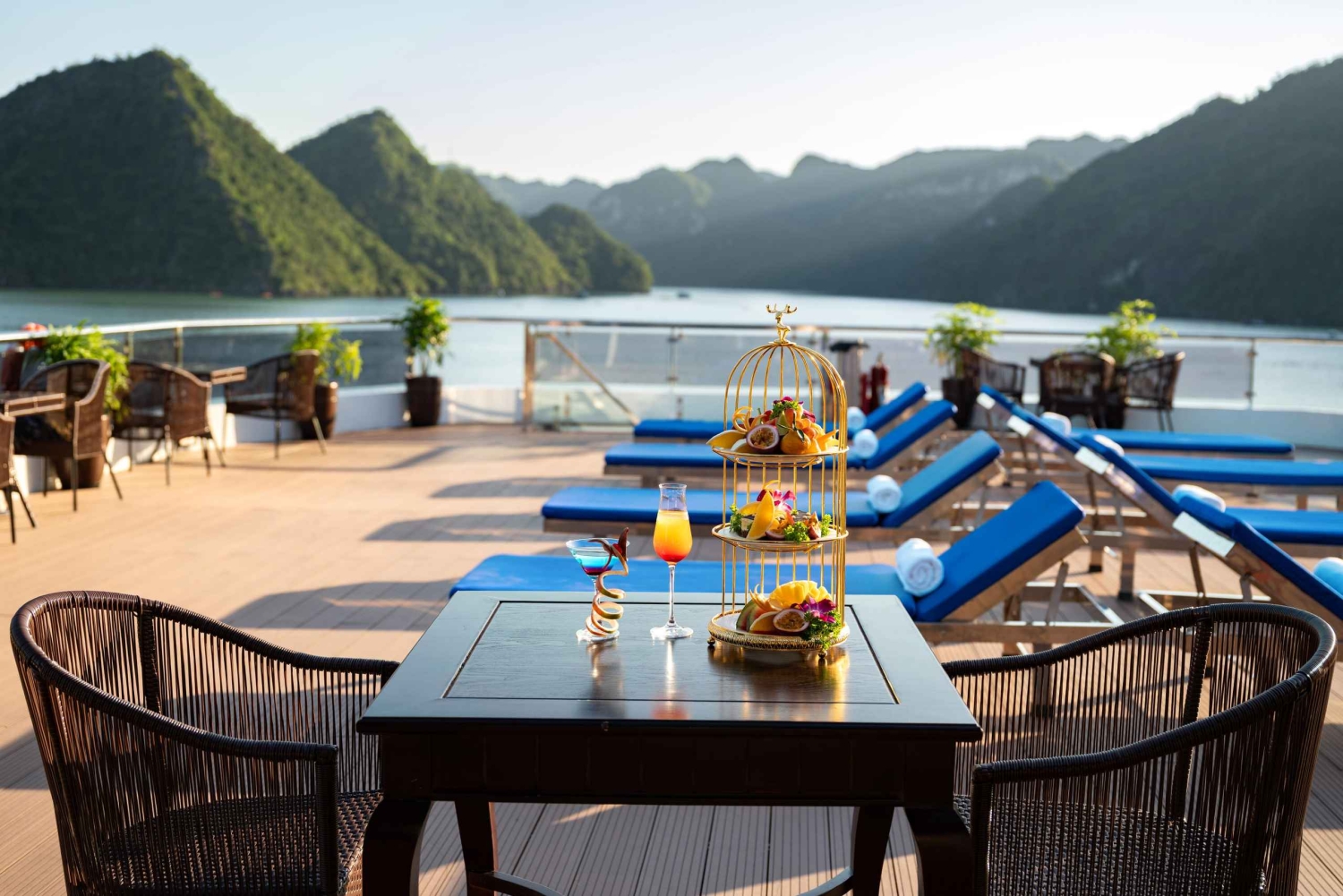 9:45 Uhr: Genieße einen köstlichen Brunch im Restaurant, während die Kreuzfahrt zurück zum Jachthafen Tuan Chau fährt.