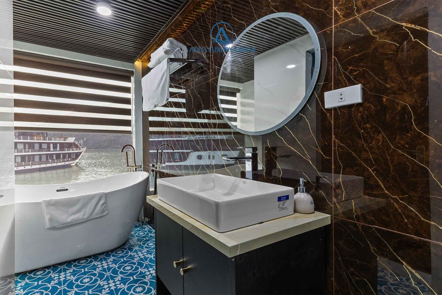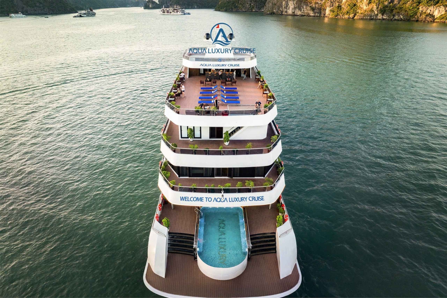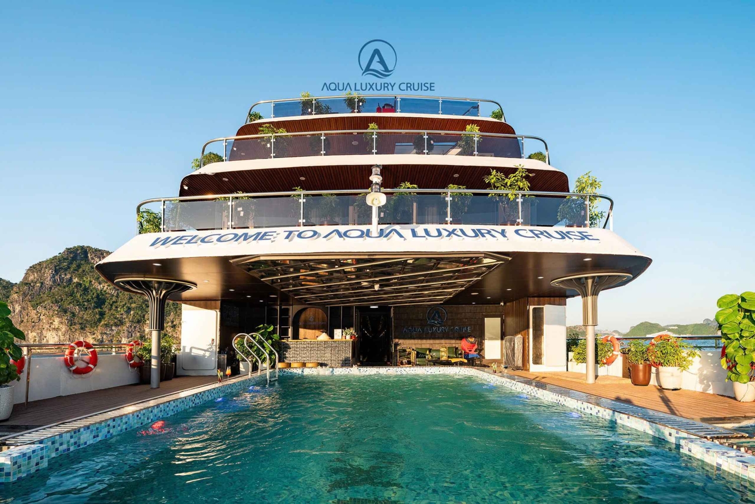 14:45 Uhr: Die Aqua Luxury Cruise kommt auf der Insel Tra Bau in der Lan Ha Bay an. Genieße Kajakfahren und Schwimmen im kristallklaren Wasser.