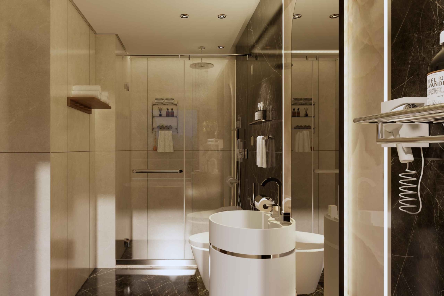 Eine Luxuskreuzfahrt mit privaten Balkonen, Badewannen mit Blick auf die Bucht, einem Restaurant, einem Swimmingpool, einem Spa, einem Fitnessraum und einem Minigolfplatz.