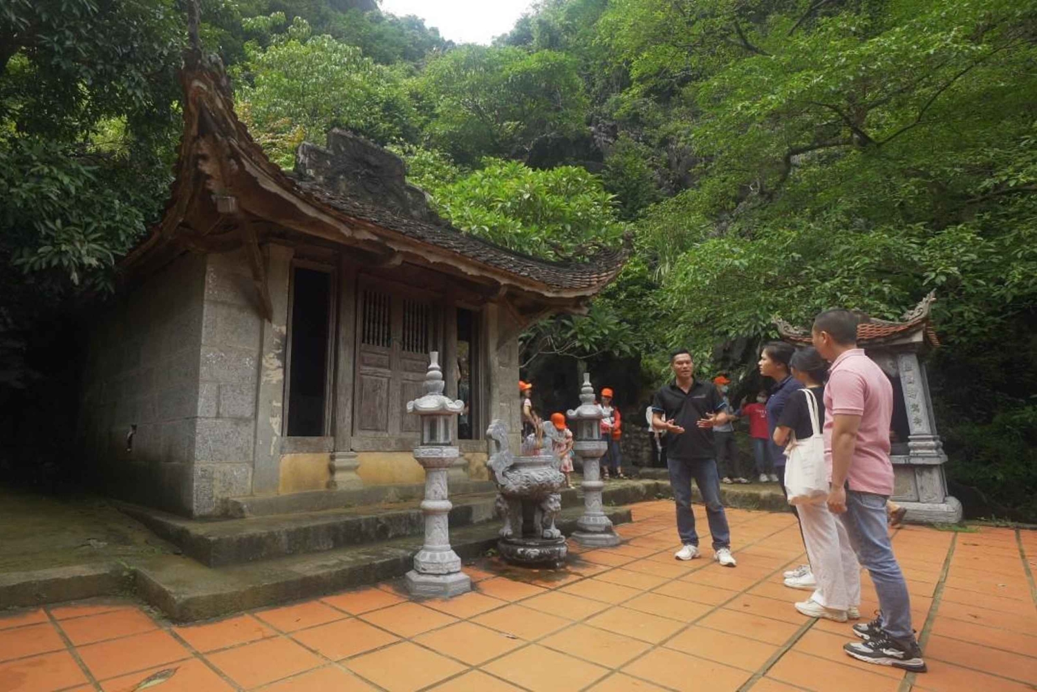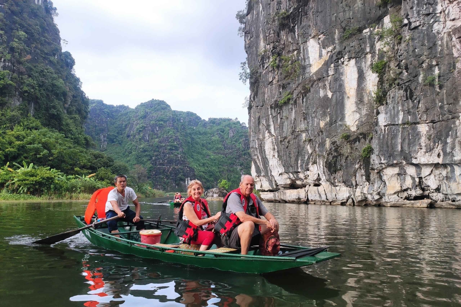 Entdecke Tam Coc mit dem Sampan-Boot und genieße die Schönheit der Höhlen und des Kalksteinbergs am Fluss, der an Land Ha Long heißt.