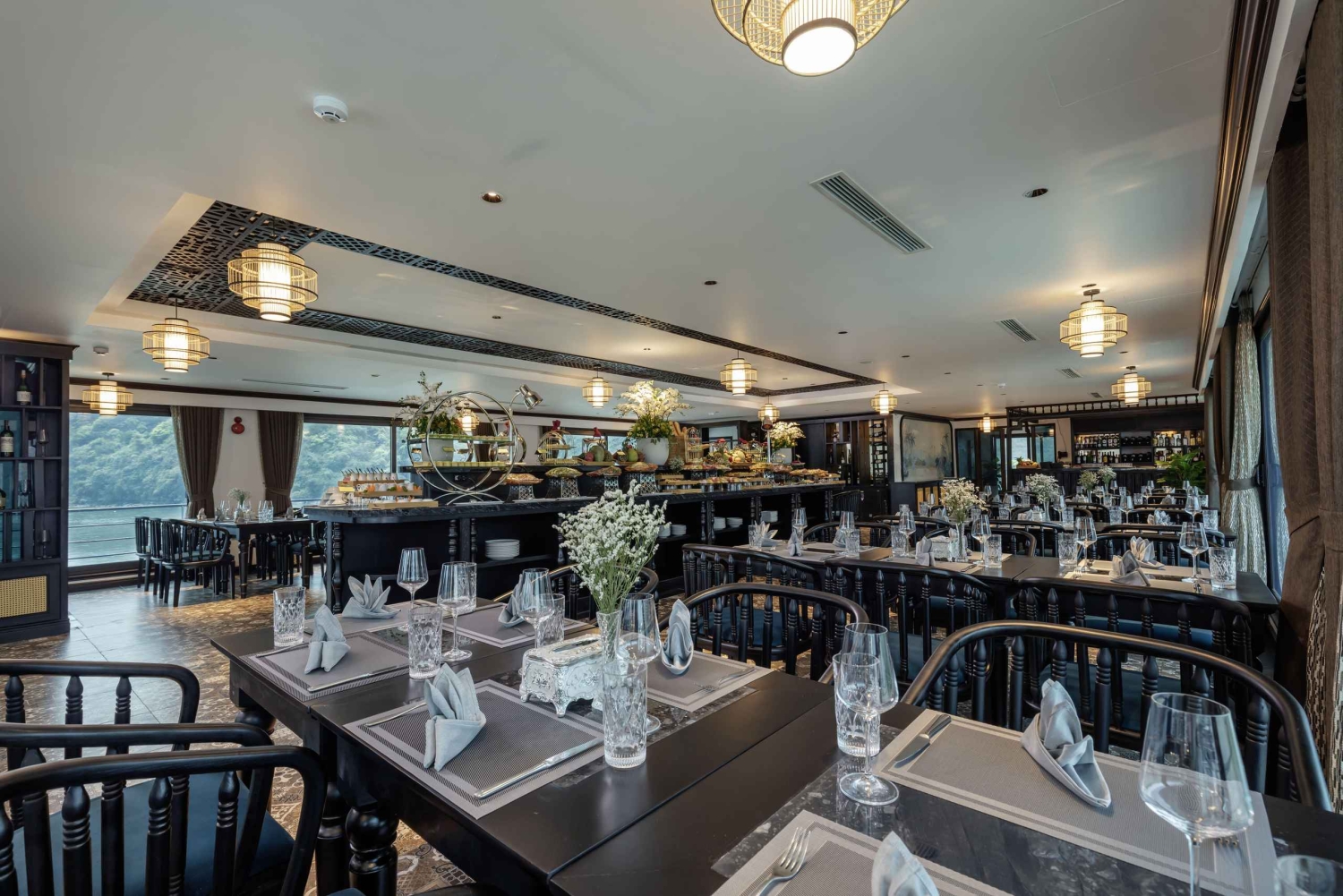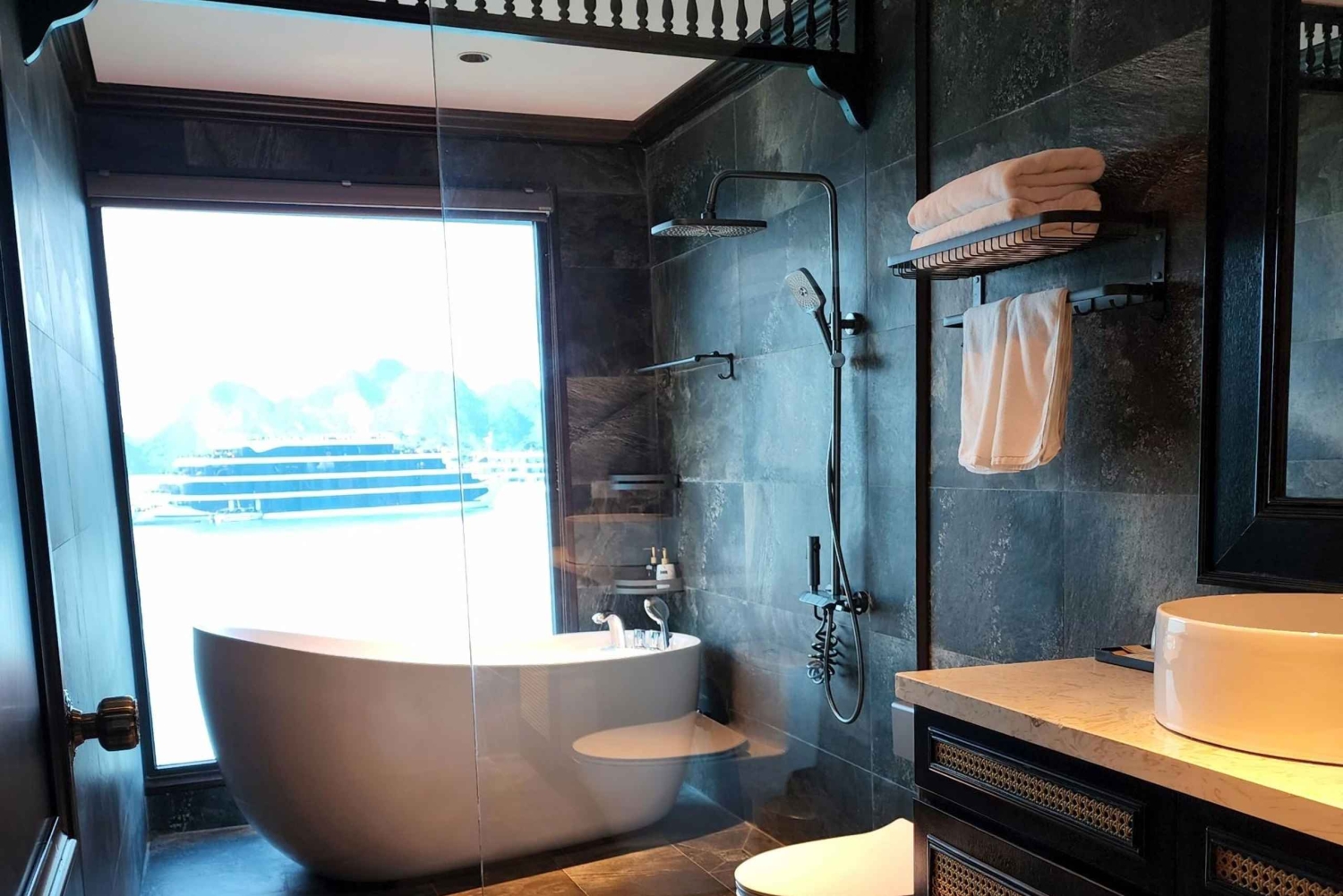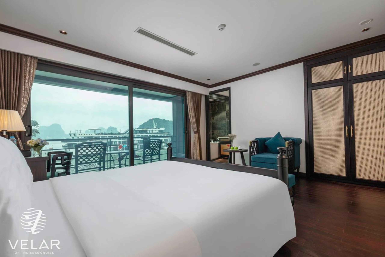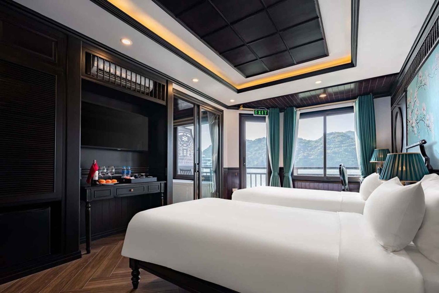 Despiértate con el sonido de las olas contra el casco, abre la puerta del balcón y disfruta del aire fresco y la brisa matutina. Despierta tu cuerpo con taichí en la cubierta o date un chapuzón en la piscina de temporada mientras el sol sale por encima de los picos de piedra caliza.