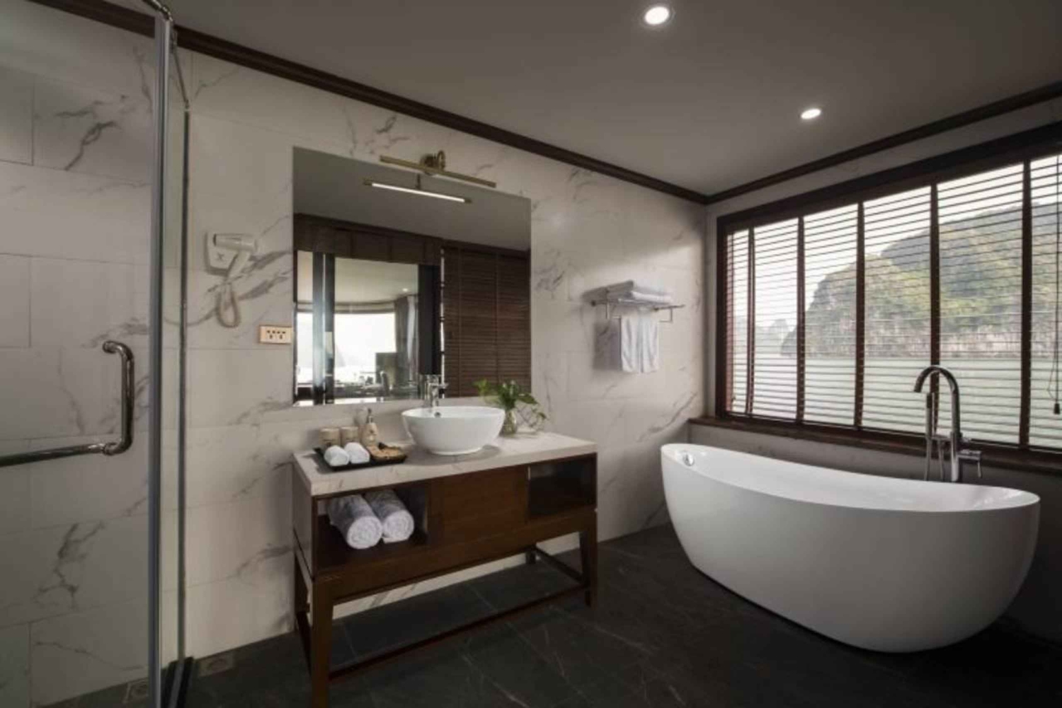 Disfruta de las bahías de Halong y Lan Ha a bordo de un crucero de lujo con balcón y habitación con bañera. Haz kayak en cuevas escondidas, saborea comidas gourmet y participa en una sesión de tai chi.