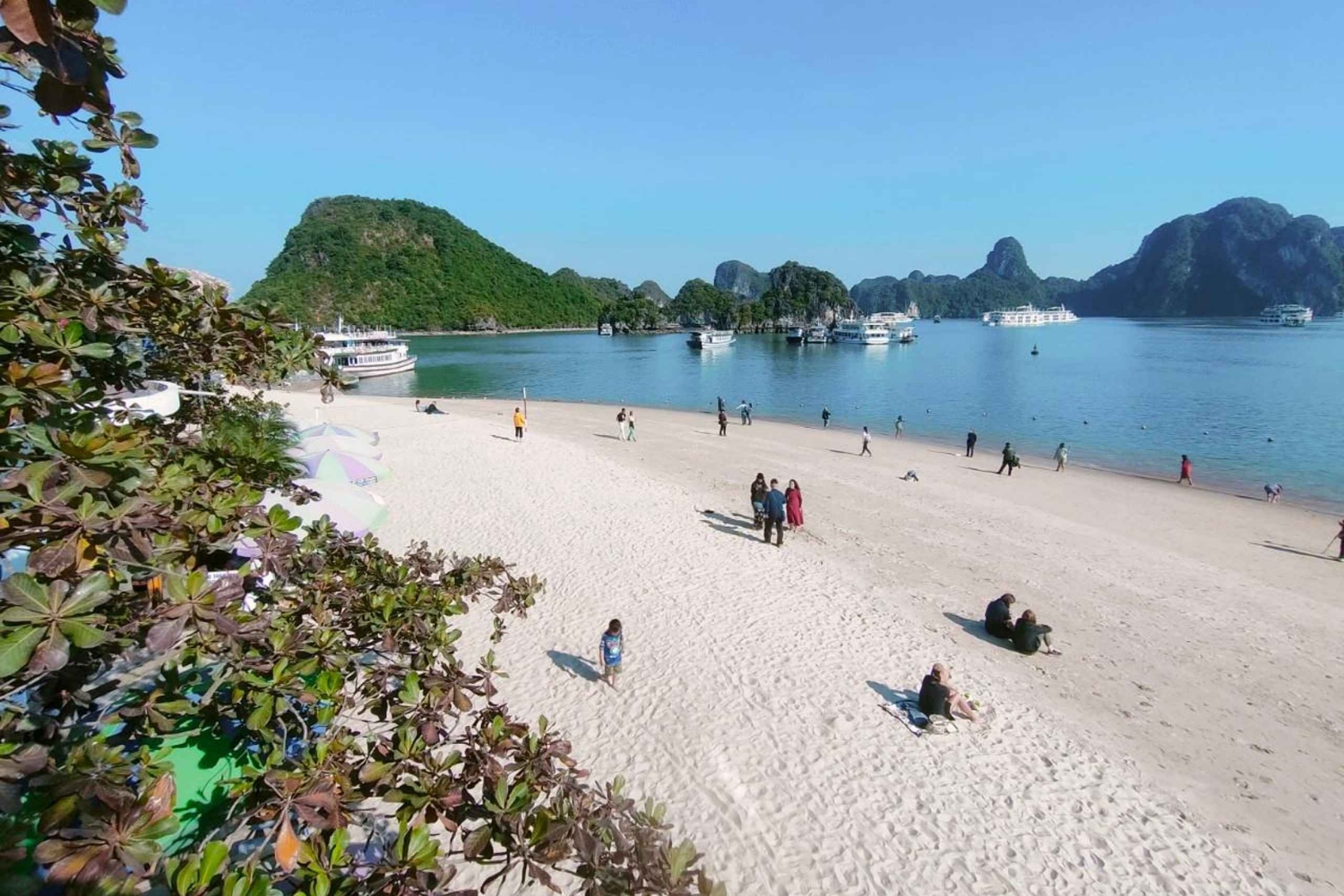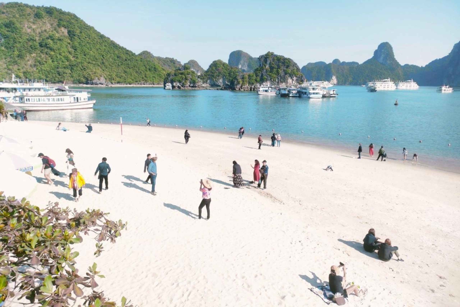 Explora la BahÃa de Halong en barco en esta excursión de un dÃa desde Hanói. Navega en kayak por la cueva de Luon, haz una parada en la pintoresca isla de Titop para nadar y disfruta de la comida y el vino a bordo de tu barco.