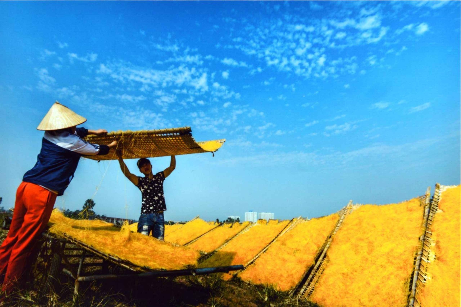 Descubre los famosos vermicelli del pueblo, un elemento básico de la cultura culinaria vietnamita. Aprende el proceso tradicional de elaboración de los fideos, que consiste en moler la arrurruz, mezclarla con agua para hacer una pasta y luego cocinarla al vapor y secarla al sol. Sé testigo del laborioso proceso que se ha transmitido de generación en generación.