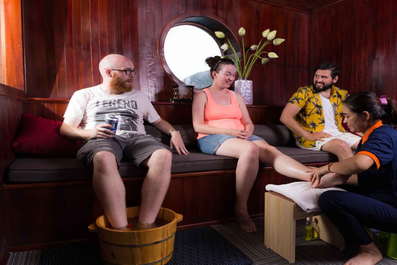 A mediodía, disfruta de un delicioso almuerzo a bordo mientras sigues navegando por la bahía y te maravillas con las impresionantes y magníficas montañas de piedra caliza que te rodean. Después de comer, llega a la Cueva de Sung Sot, una cueva natural en medio del mar que alberga un conjunto de estalactitas y estalagmitas de increíble belleza.