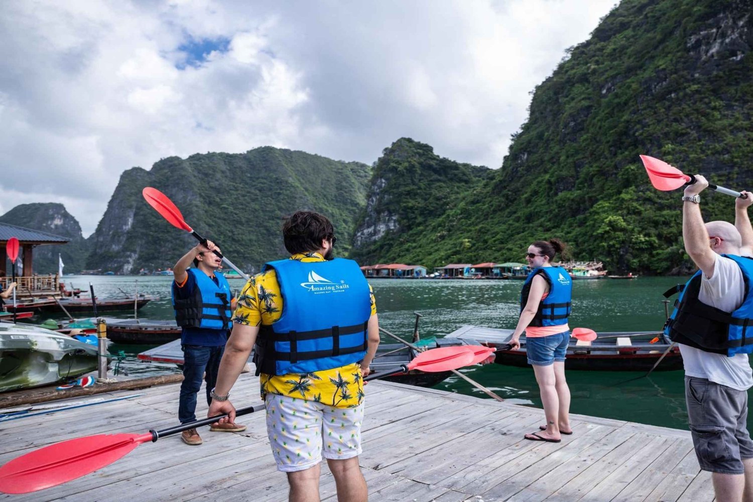 Explora la Cueva de Luon (cueva acuática) en kayak o en una barca local de bambú a remo. La Cueva de Luon es como una puerta que abre un país de las maravillas con agua y montañas de piedra caliza en la Bahía de Halong.