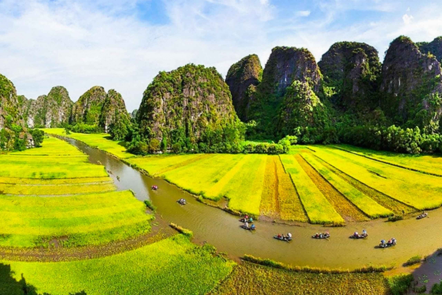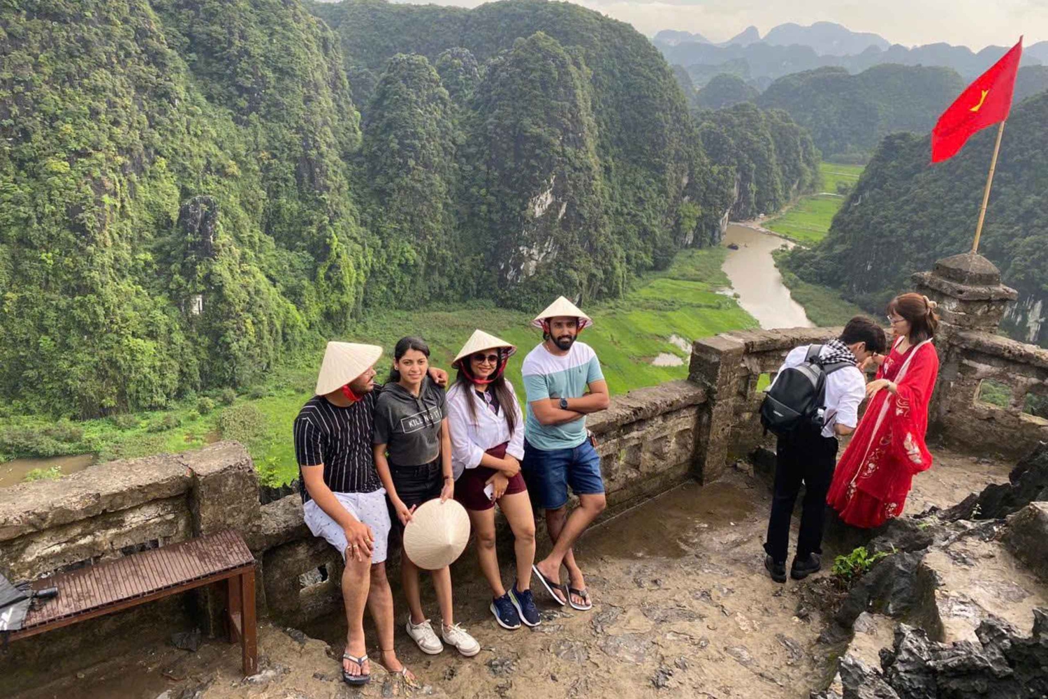 7h30 - 8h00: The air-conditioned bus will pick you up at your hotel in Ha Noi Old Quarter. Follow the ban on buses picking up passengers on some streets in Hanoi between 6h30 and 8h30, we maybe need you to come to our good meeting points to start your trip. It’s take more or less 2,0 hours from Hanoi to Hoa Lu with a short break about 20 minutes on the half way. 10h30 - 10h40: You will reach to Hoa Lu ancient capital of Vietnam. You will visit Dinh King temple and Le King temple in the 10th centery, finding out the heroic histories of this two kings in Chinese Wars. 11h50 - 12h00: You will have a lunch at the restaurant ( vegetarian food is also available) 13h00 - 13h05: Option 1: Get on the bus continue going to Tam Coc wharf, take the sampan go along the Ngo Dong river to visit Tam Coc (three different caves) Option 2: Get on the bus go to Trang An wharf for enjoying unique sampan to visit Trang An cave complex 15h00 - 15h05: Biking to visit the local village in Ninh Binh (Optional), If you don't want to cycle, you can explore the village on foot or take rest at the local restaurant 15h30 - 15h35: Keep going to visit Mua cave. The place attracts visitors with it’s many interesting stories. In here you can see all the way to Tam Coc, enjoy a stunning panoramic view of the countryside and Ngo Dong river. 16h45 - 17h00: Get on the bus to return Ha Noi. 19h00 - 19h30: Arrive Ha Noi, drop off at your hotel/ at the meeting point in Ha Noi Old Quarter. End the tour!