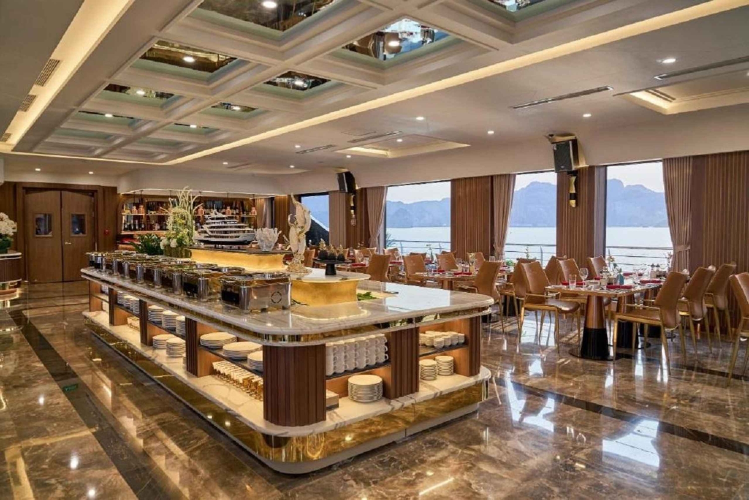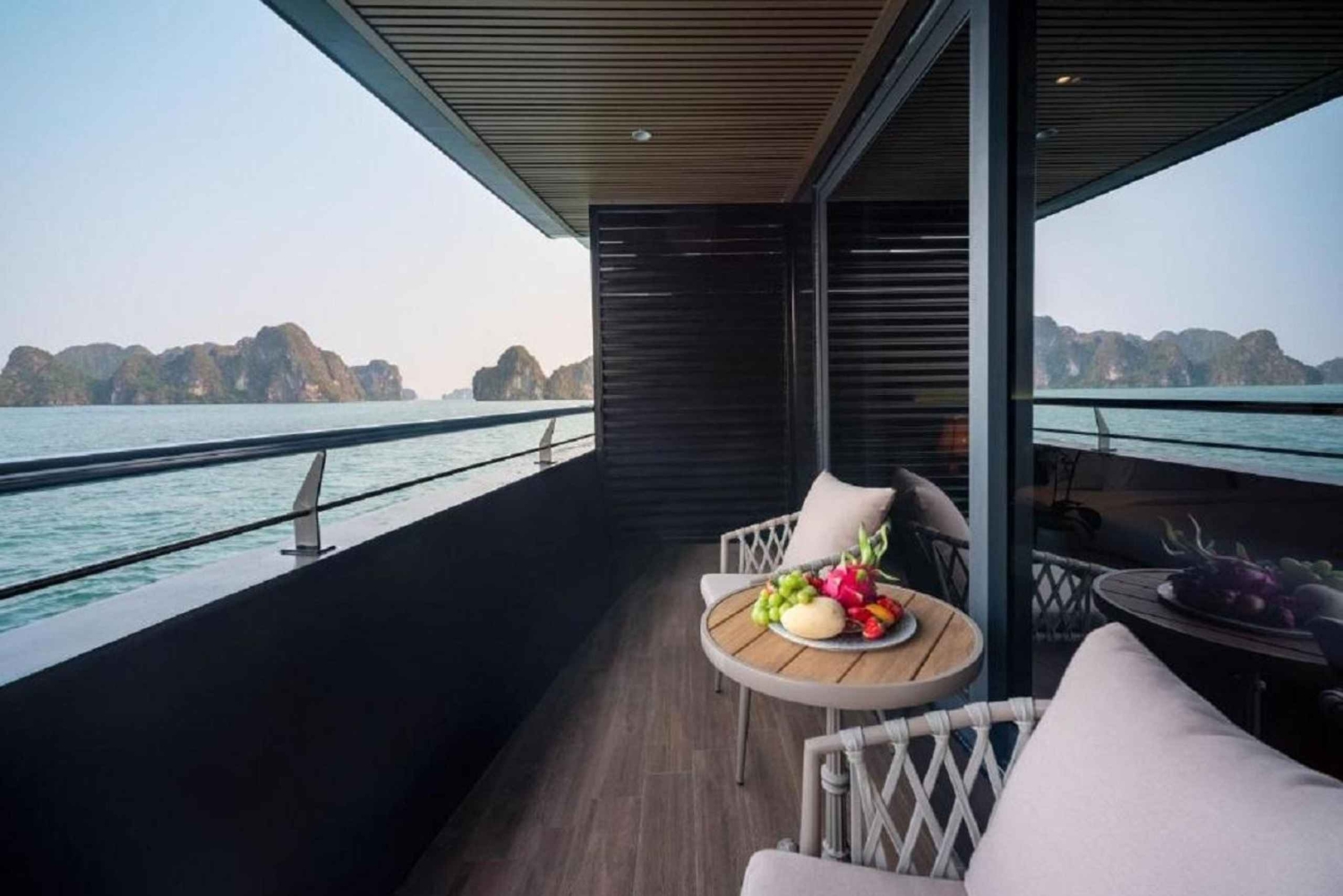 13.00: Sinulla on aikaa nauttia herkullinen buffetlounas ja upeat näkymät, kun vene risteilee kohti Halongin lahden kaakkoisosaa ja ohittaa Fighting Cock- ja Finger-saaret.