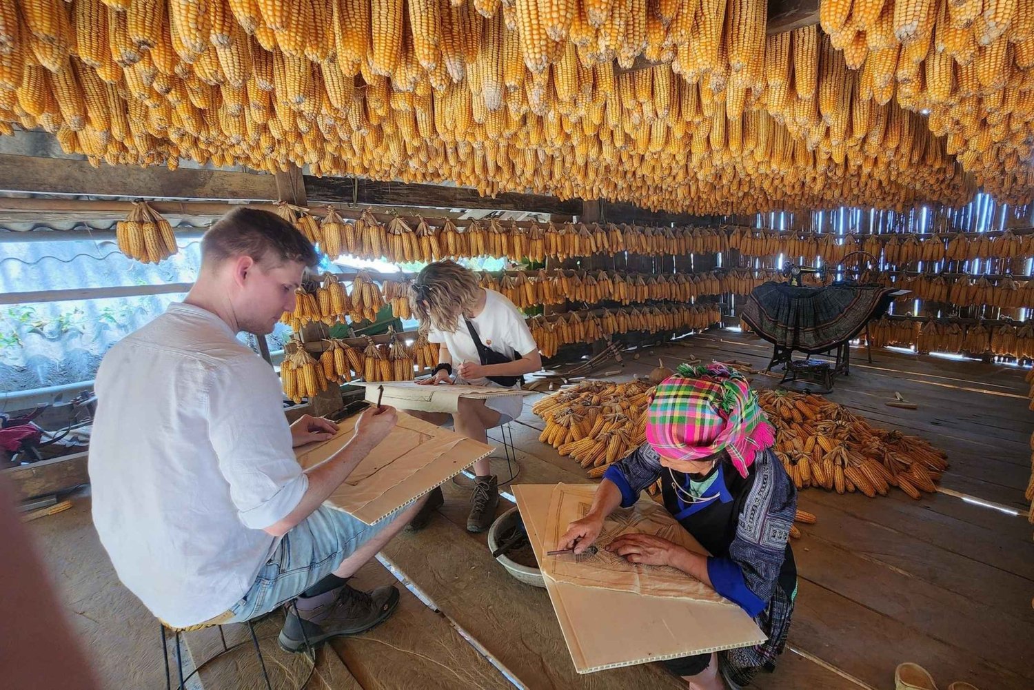Traversez le légendaire col de Khau Pha, avec ses vues à couper le souffle et ses courbes couvertes de nuages. Au sommet, choisissez l'une des deux activités culturelles optionnelles : parapente au-dessus des terrasses dorées ou atelier de batik à La Pan Tan.