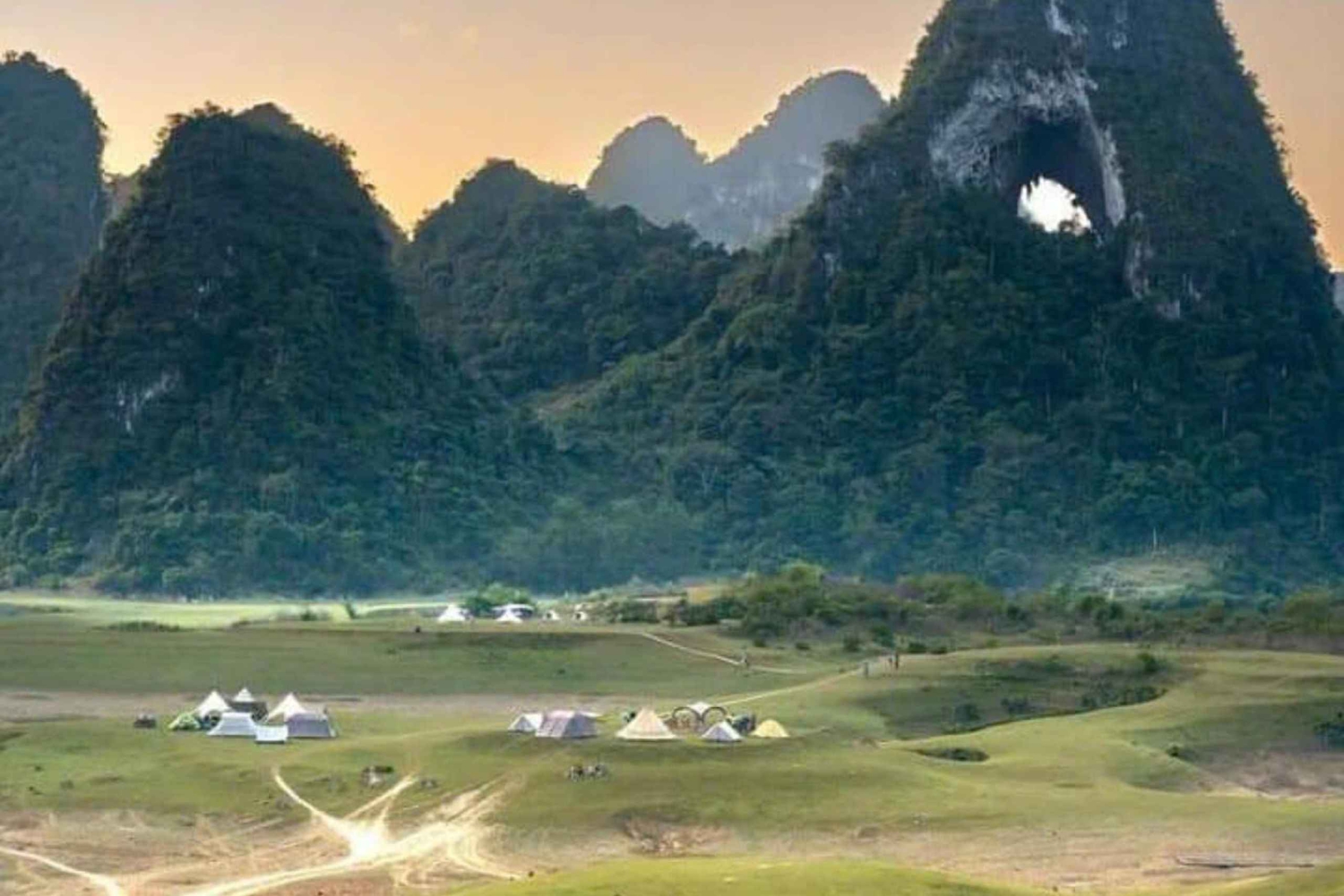 Commencez votre aventure par une prise en charge à votre hôtel à Hanoi et dirigez-vous vers la cascade de Ban Gioc. Arrêtez-vous pour déjeuner dans un restaurant local, puis visitez la montagne de l'Œil d'ange, qui possède un trou de passage (montagne Thung, située dans le district de Quang Uyen).