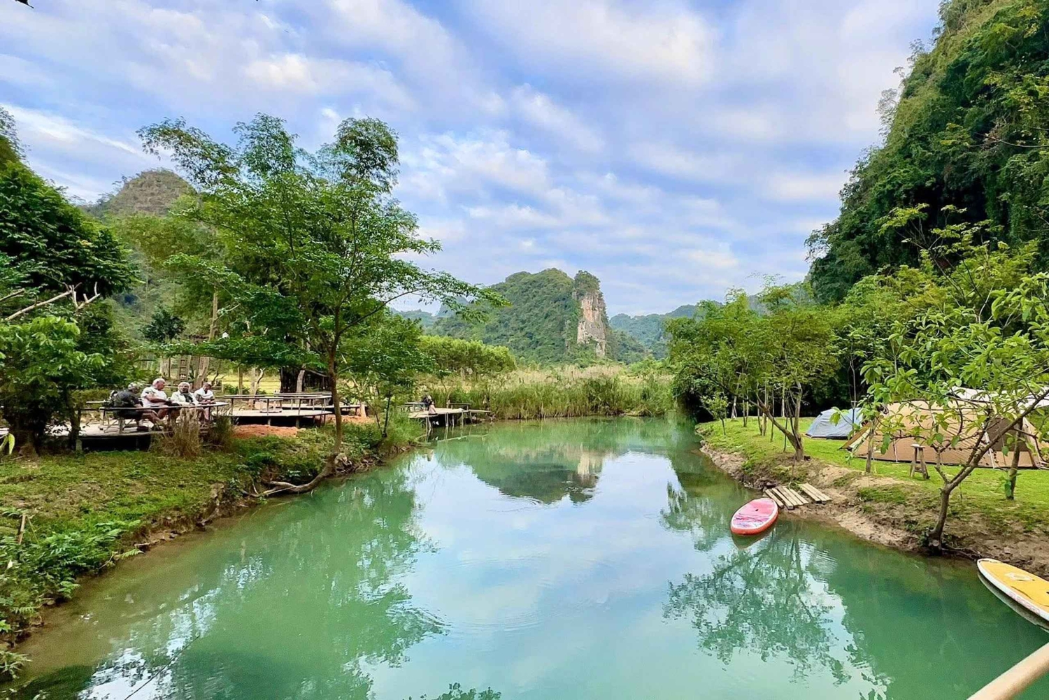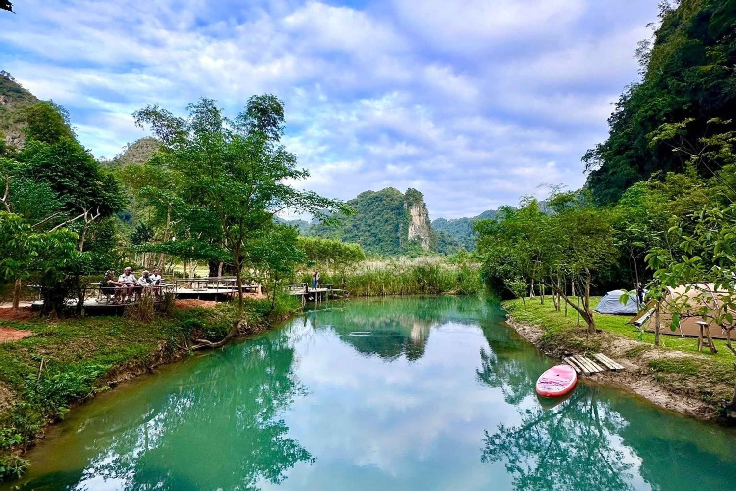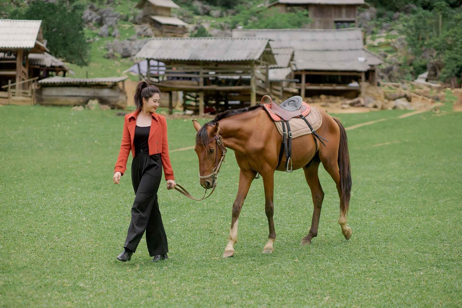 Ensuite, rendez-vous à Mai Chau pour le déjeuner. Explorez la vallée de Mai Chau à vélo ou en voiture électrique (frais de location non inclus). Visitez les petites maisons sur pilotis du peuple thaïlandais, découvrez leur culture unique et achetez des souvenirs aux étals de brocart.