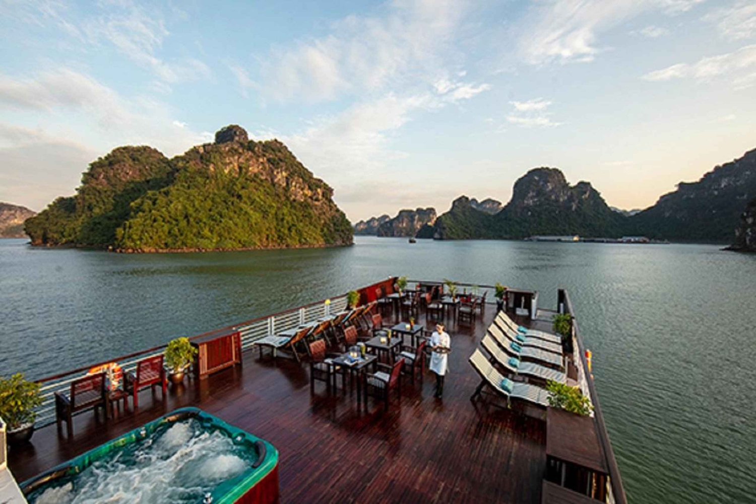 Commencez votre aventure par une prise en charge en limousine et dirigez-vous vers le port de Tuan Chau. Profitez d'une boisson de bienvenue et d'un enregistrement express avant d'embarquer pour votre croisière.