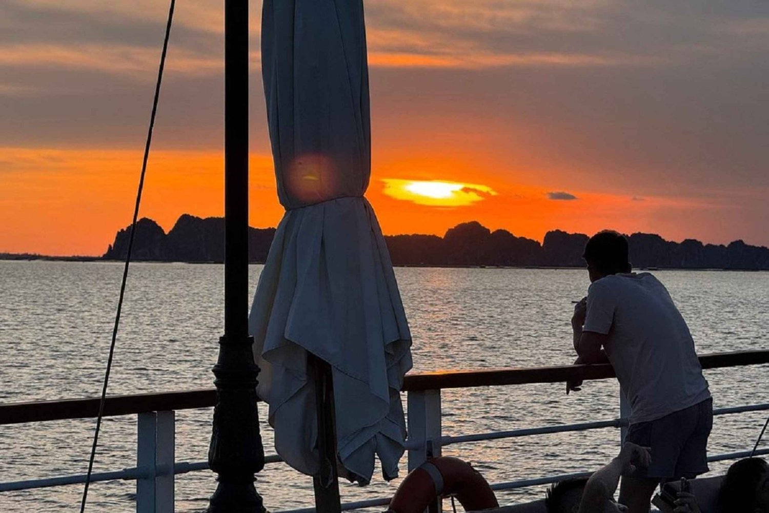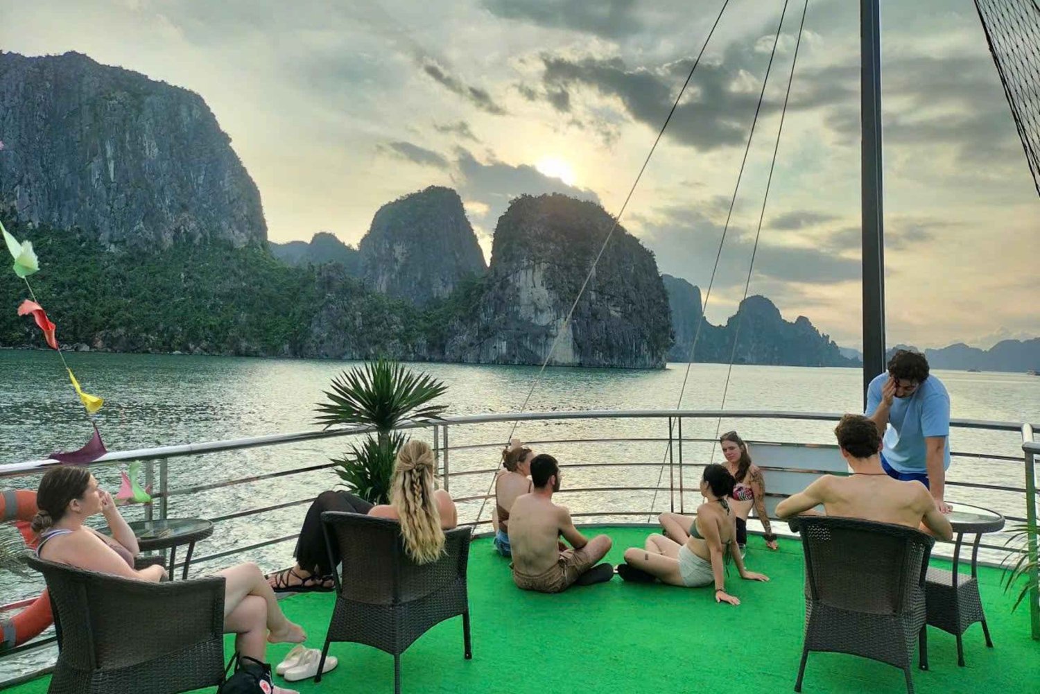 Crociera di lusso di un giorno nella baia di Ha Long da Hanoi o Tuan Chau: esplora grotte, fai kayak nelle lagune, rilassati sull'isola di Titop, goditi il pranzo a bordo e la festa al tramonto.