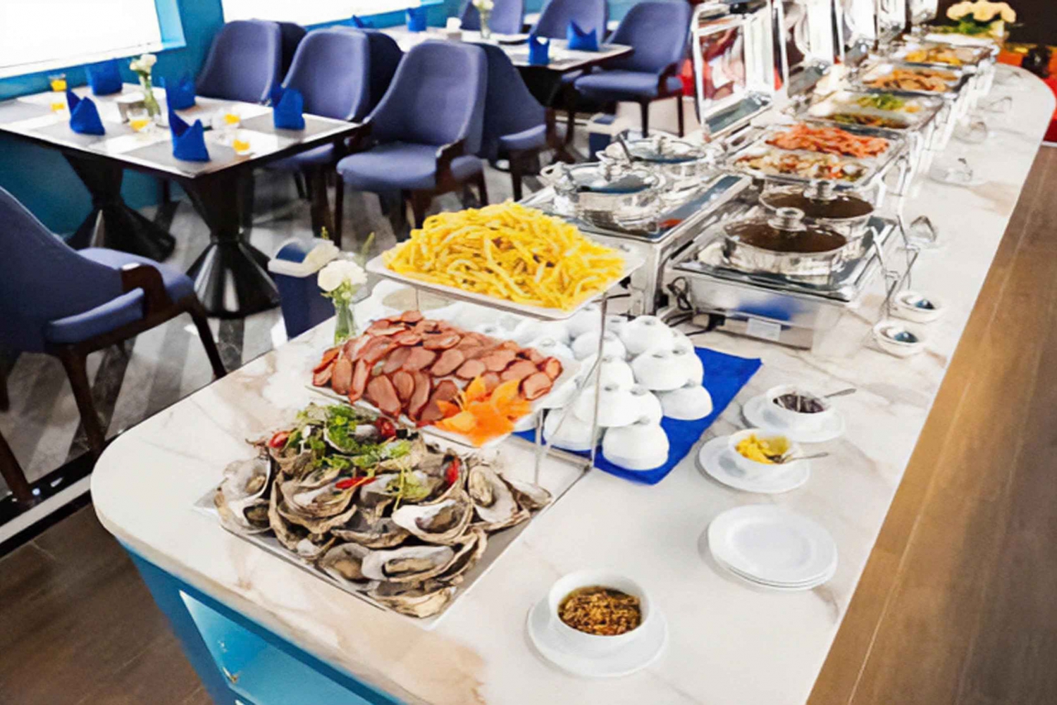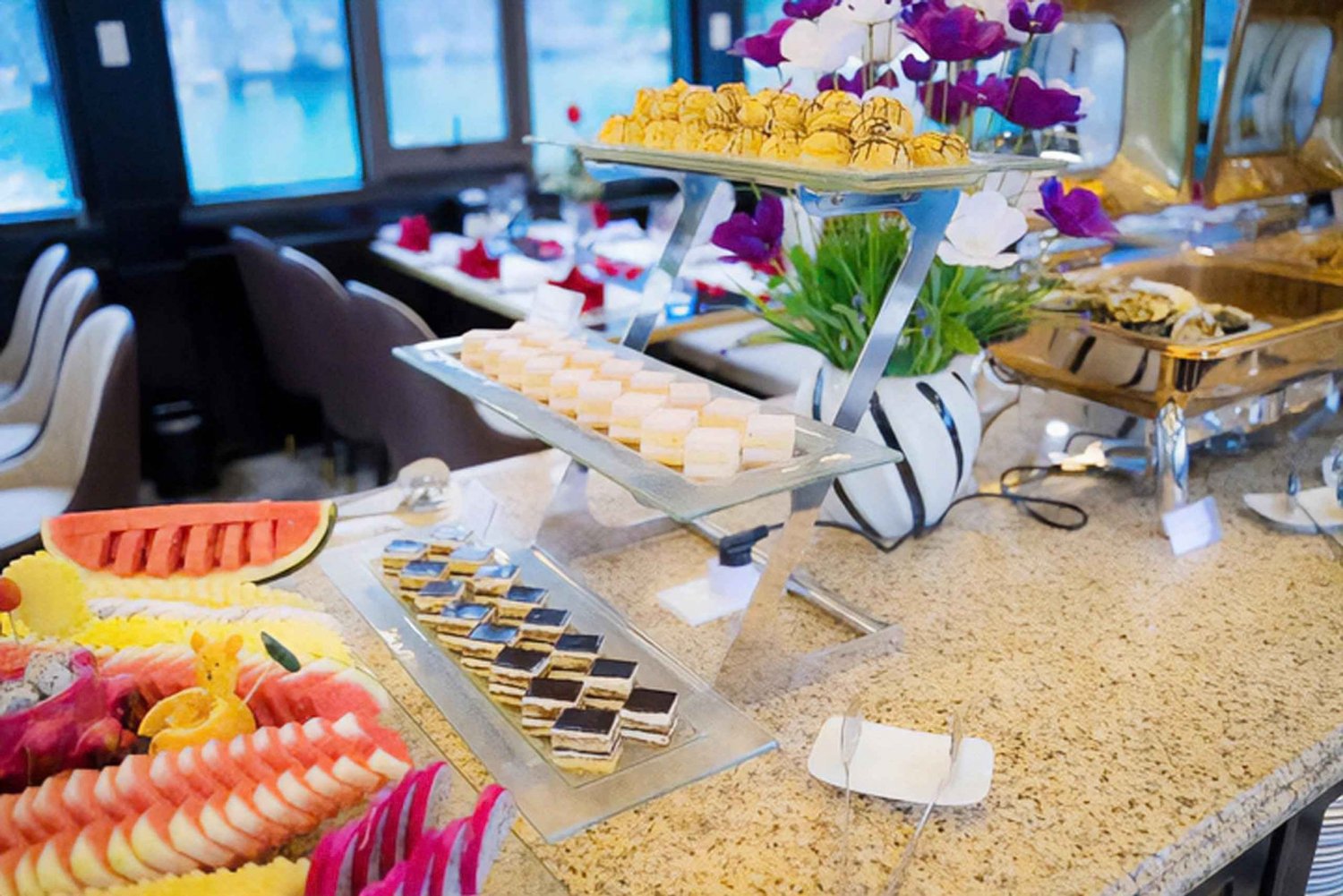 12:30: Goditi un pranzo speciale con più di 30 piatti a bordo della barca. Durante il pranzo, la barca passerà accanto ai bellissimi paesaggi su entrambi i lati con migliaia di pietre calcaree come gli isolotti Fighting Chicken e Incense Buner, due simboli della baia di Halong.