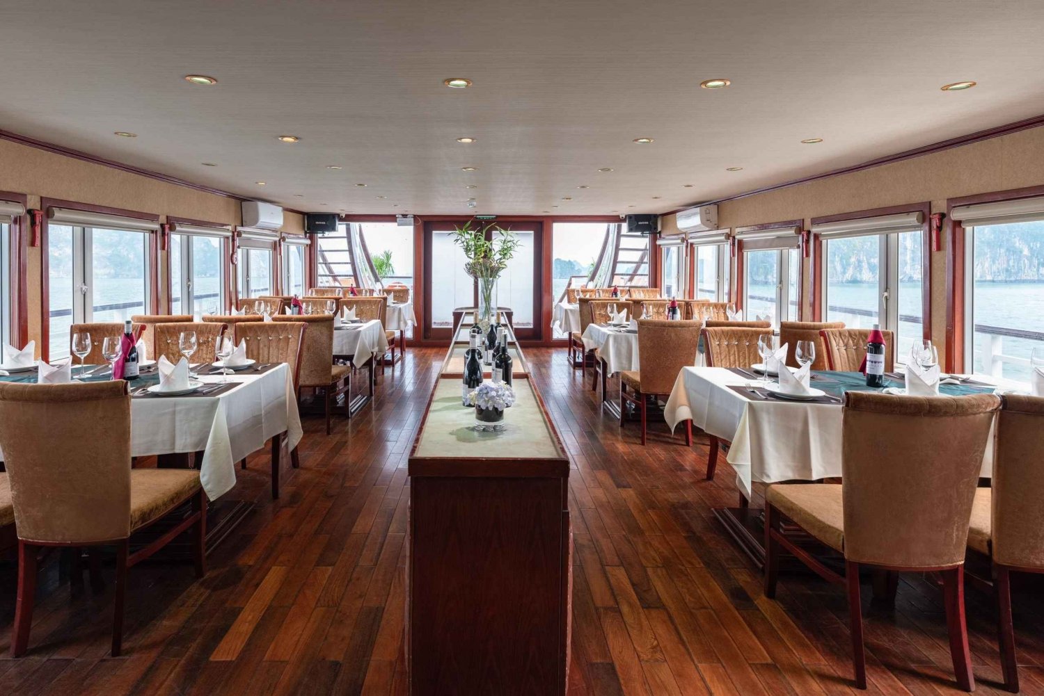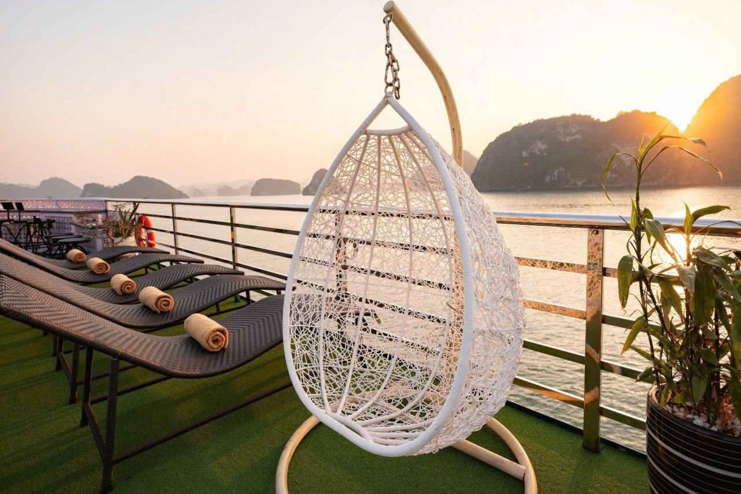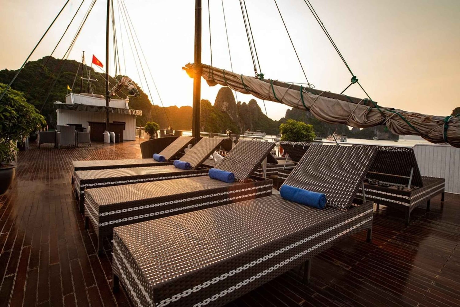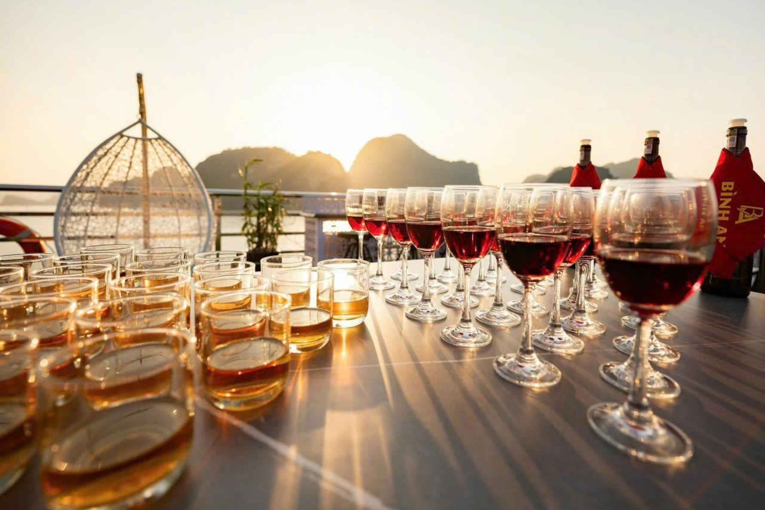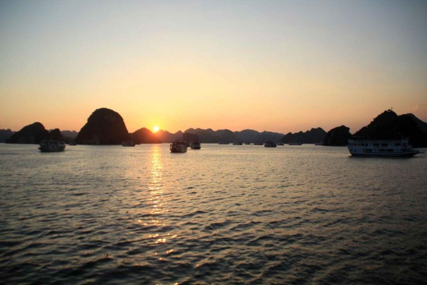 Rilassati un po' prima di tornare sulla barca per goderti una festa al tramonto con vino rosso, patatine fritte, torte e frutta. Dopo aver raggiunto il porto di Ha Long, l'autista ti riporterà ad Hanoi.