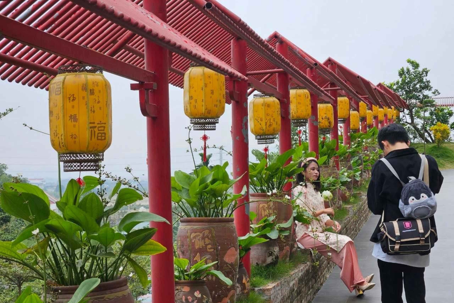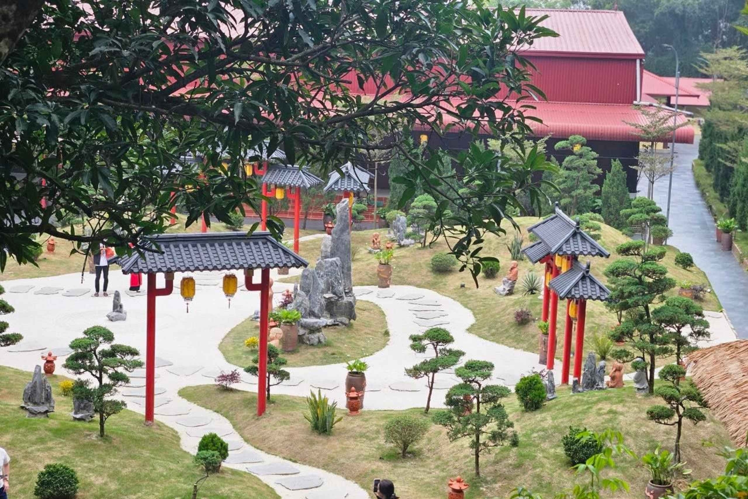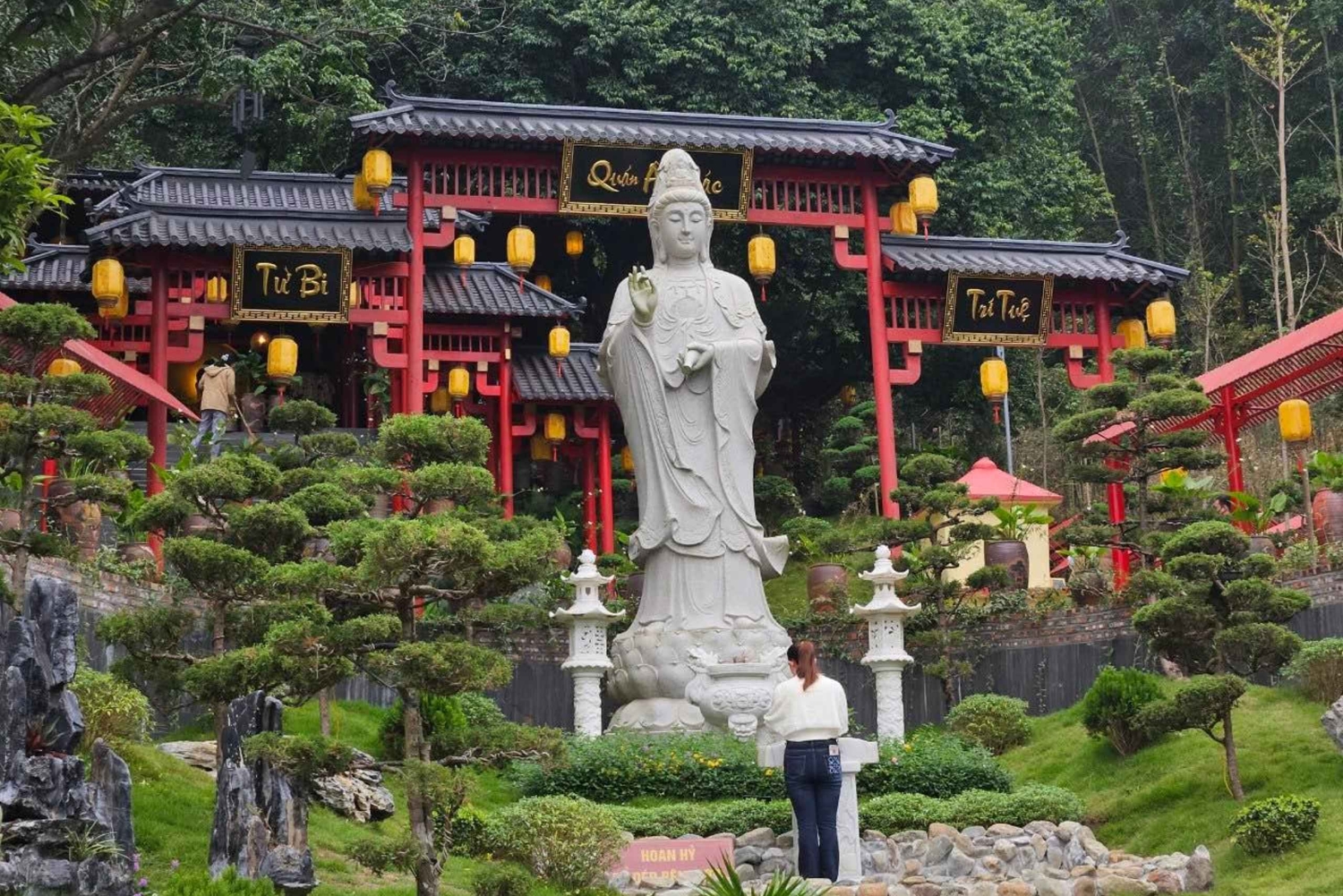 Inizia il tuo viaggio ai piedi della montagna, dove puoi intravedere la statua in granito alta 6 metri del Bodhisattva Avalokiteshvara che si erge solennemente in cima alla collina. Prosegui verso l'alto per raggiungere la porta del tempio e un giardino zen intriso di estetica architettonica giapponese, delicatamente intrecciato con elementi tradizionali vietnamiti.