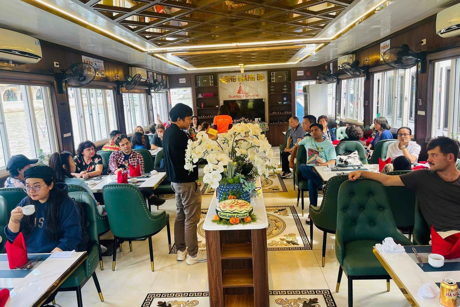 午後5時45分、トゥアンチャウ港に戻り、船上でベトナムティーを飲みながら、今日の発見を振り返ってください。最後に、午後8時20分、ハノイ旧市街のホテルまでお送りし、素晴らしい自然と豊かな文化体験に満ちた一日を締めくくります。