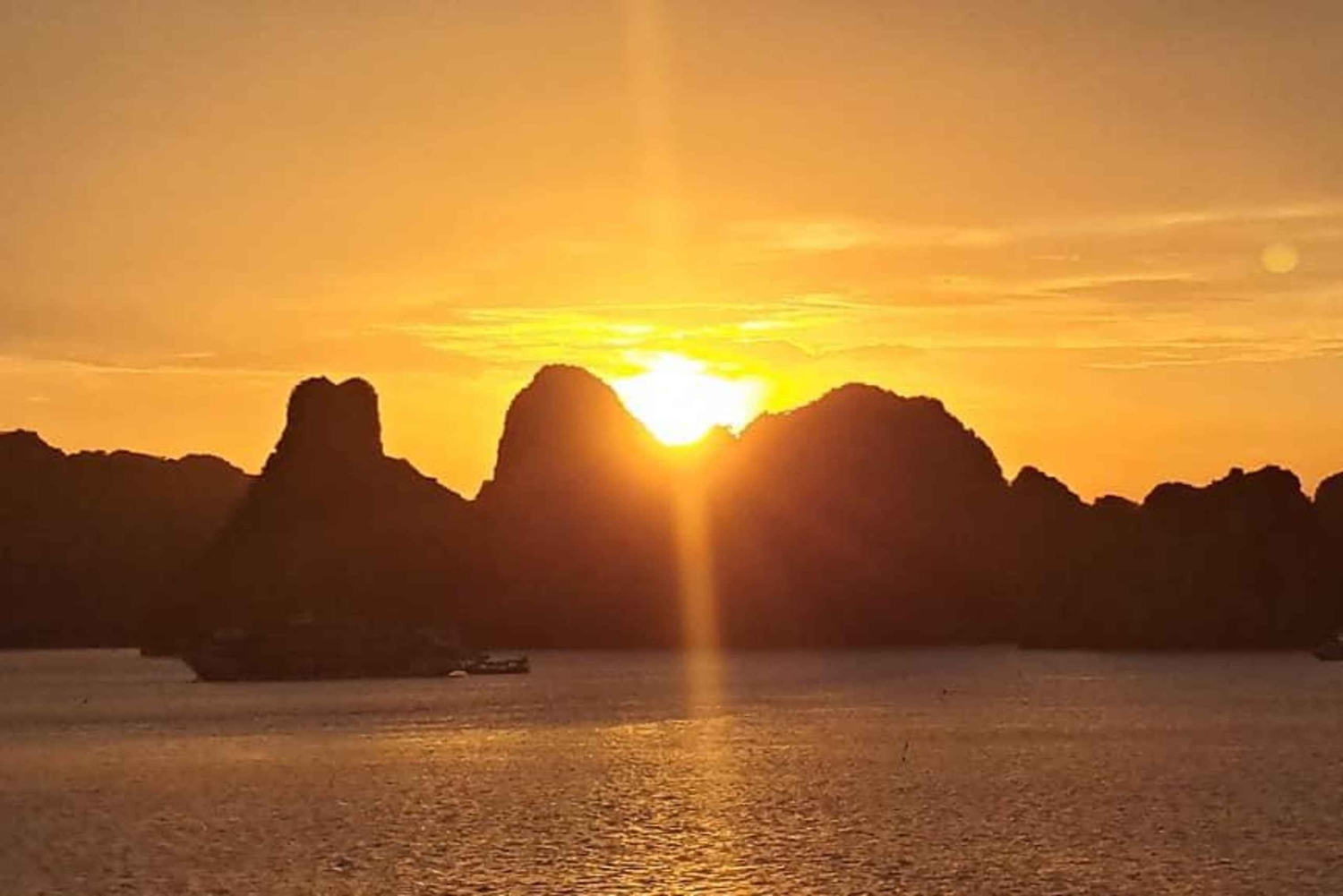 ボートに戻る前に、しばらくリラックスして、赤ワイン、フライドポテト、ケーキ、フルーツを楽しみながらサンセット パーティーをお楽しみください。ハロン港に到着後、ドライバーがハノイへお送りします。