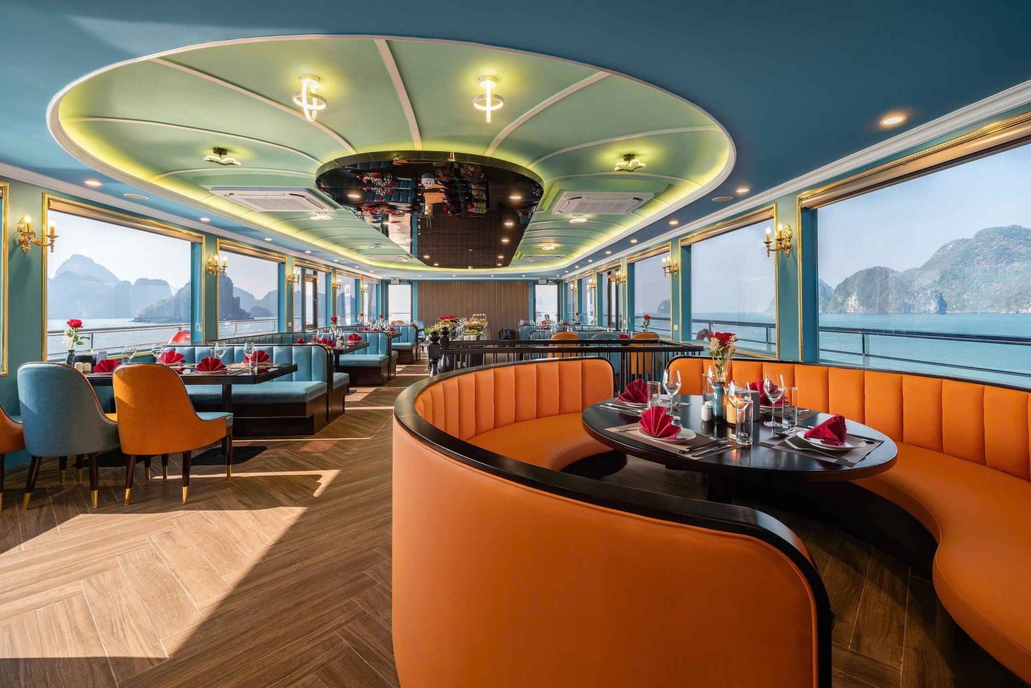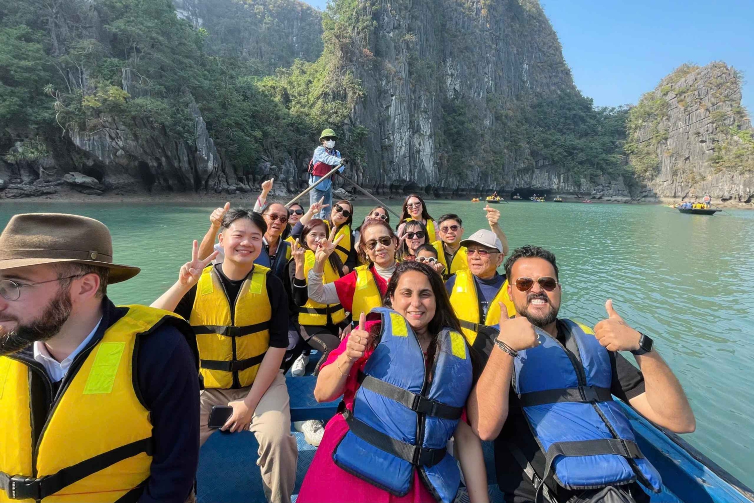 ルオン洞窟でのカヤック、ティトップ島でのハイキング、船上でのサンセットパーティーなど、ハロン湾の見どころを巡る7.5時間の贅沢な旅に出かけましょう。