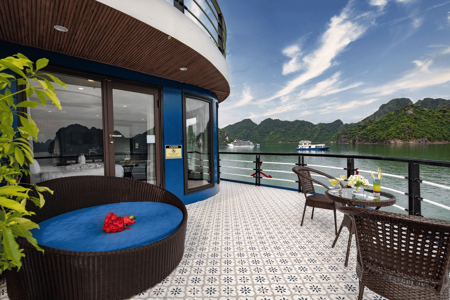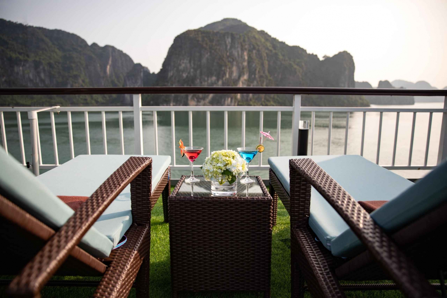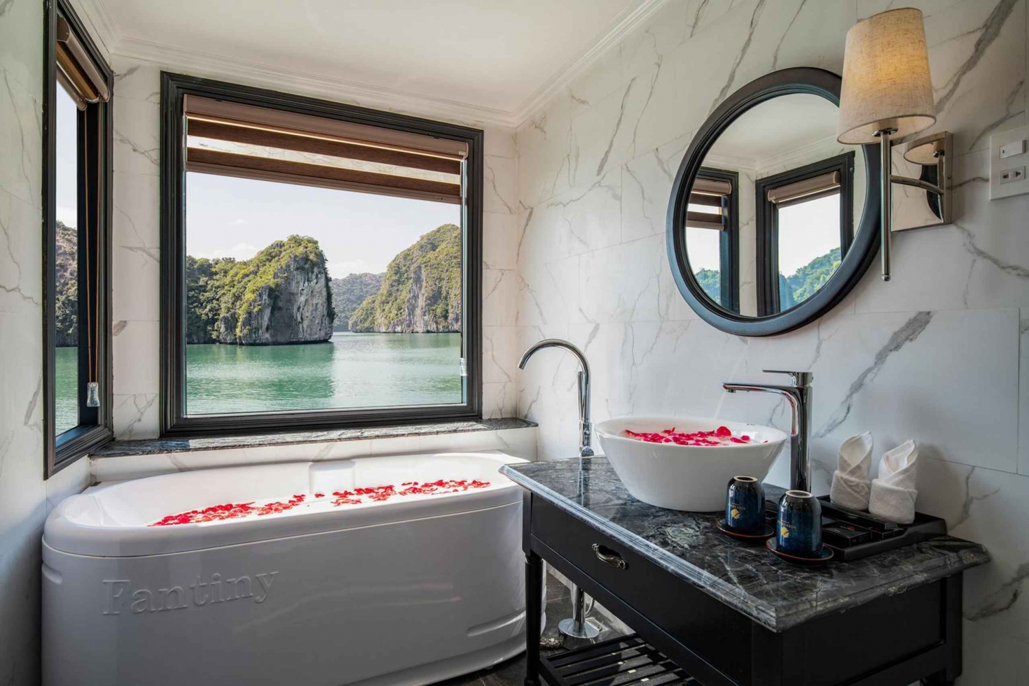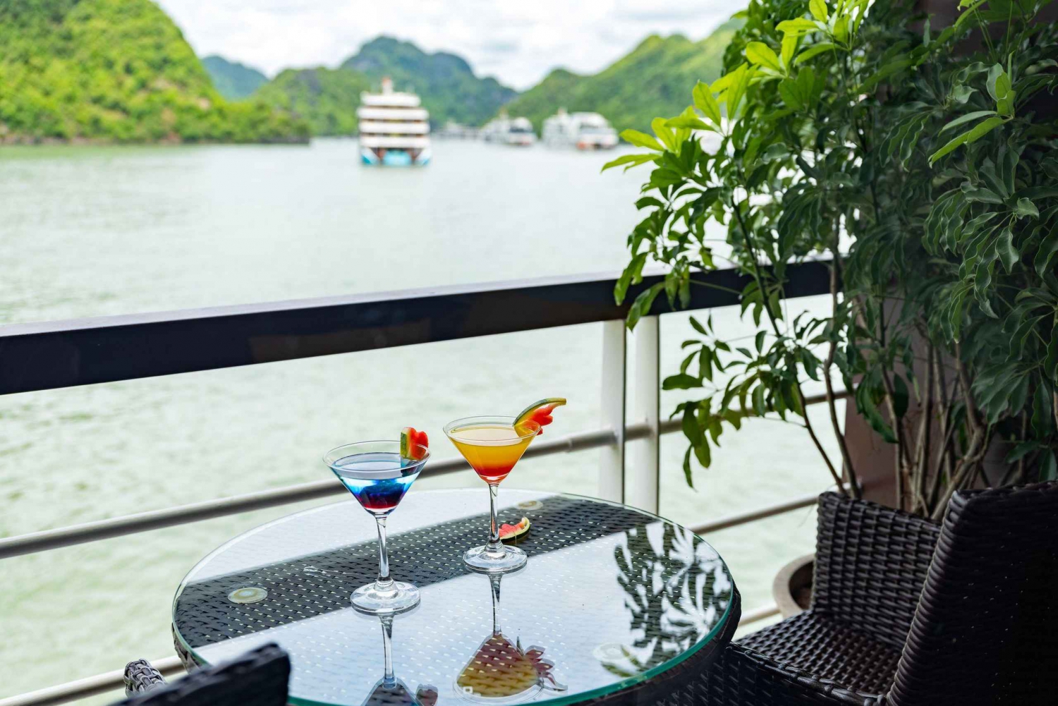ハノイからハロン湾とランハ湾への2泊1日のクルーズで、夕日を眺めながらお茶を楽しみ、竹のボートで洞窟探検を満喫してください。カヌー、湾の涼しい水でのスイミング、日の出時の太極拳、イカ釣り体験も可能です。プライベートバルコニー、船内レストラン、バー、その他の高級アメニティを備えた豪華な客室でリラックスしてください。