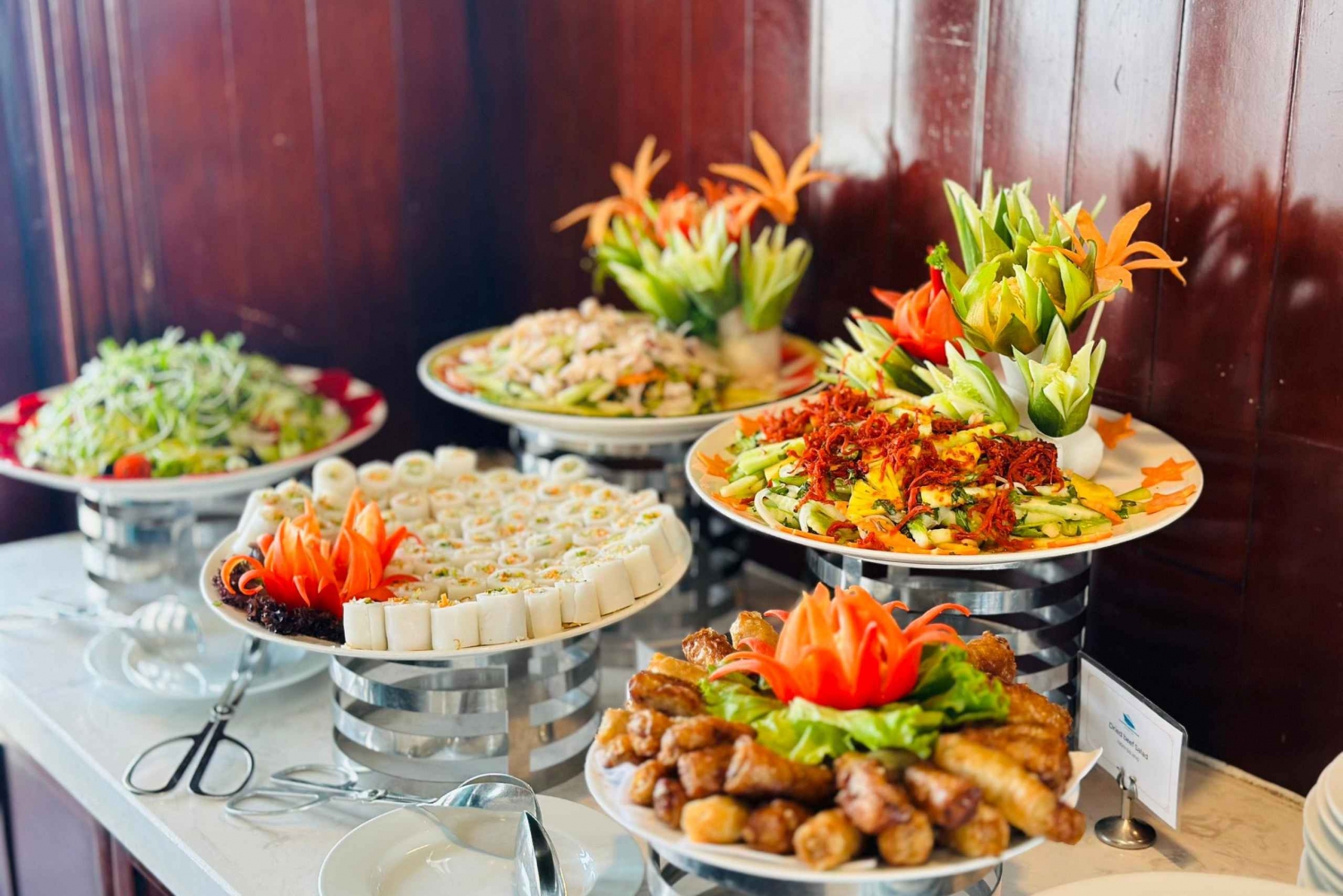 11:30-12:00 トゥアンチャウ国際クルーズ港に到着し、チェックイン手続きを行います。12:00-14:00 Le Journey Cruiseに乗船し、ウェルカムドリンクとランチをお楽しみください。14:00-17:00 驚きの洞窟とティト島を散策し、泳ぎやハイキングをお楽しみください。