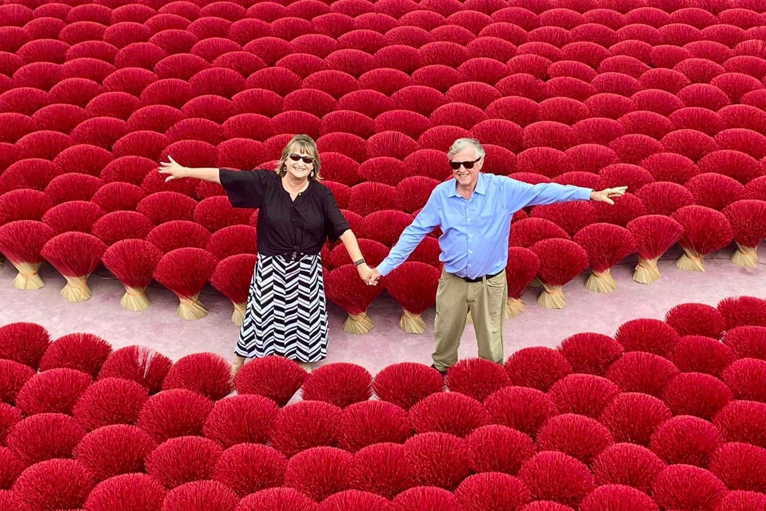 Vertrek naar het dorp Quang Phu Cau, dat al meer dan 100 jaar wierook produceert. Maak een wandeling naar het centrum van het dorp en zie hoe de lokale bevolking wierook maakt op ambachtelijke, familiale schaal. Ontmoet een familie die gespecialiseerd is in het verven van wierookstokjes.