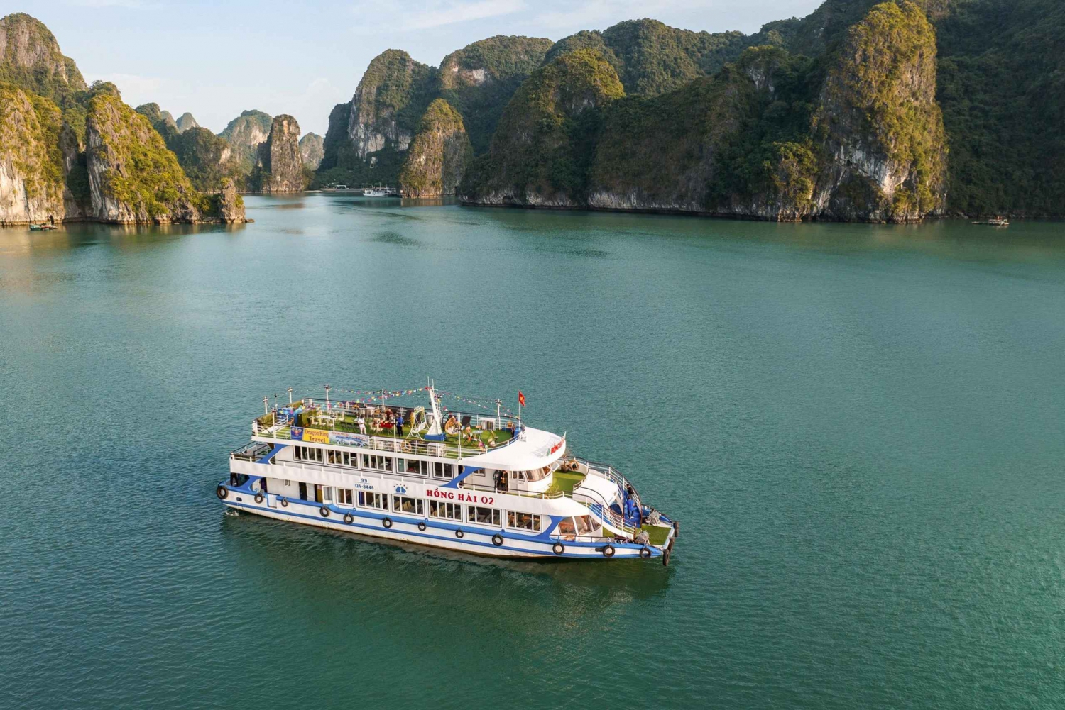 Ontdek de schoonheid van Halong Bay 1 dag op een boot. Geniet van een traditionele lunch met zeevruchten, bezoek Surprise Cave, zwem en wandel naar Titop Island, kajak in Luon Grotto en geniet van een zonsondergang in de baai.
