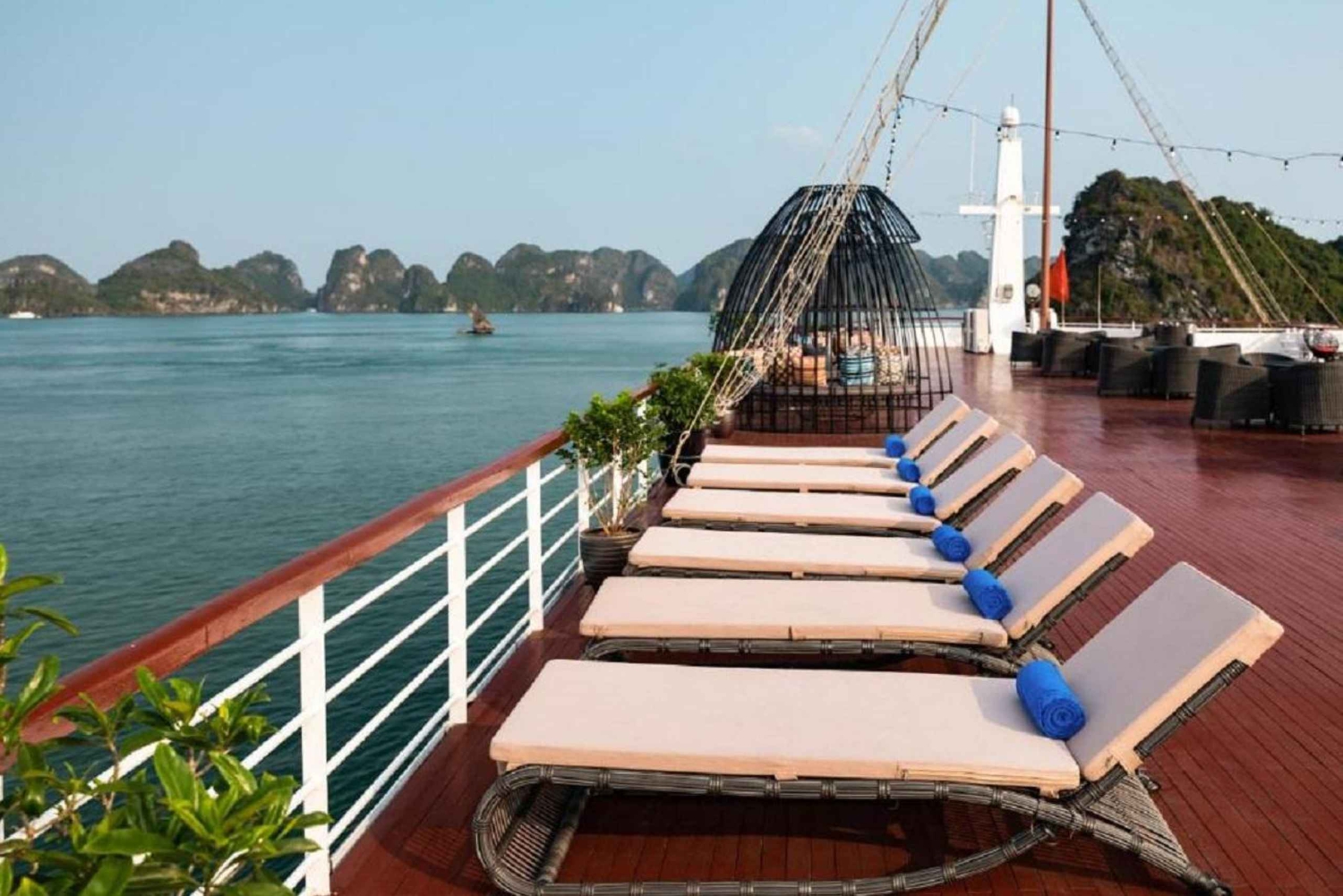 12.00: Velkomstdrinker og lunsj. Cruise gjennom Con Vit Islet, Thumb Islet, Gia Luan havn og Lan Ha Bay. Kast anker for kajakkpadling eller svømming på Ba Trai Dao-stranden eller, avhengig av været, besøk Dark Cave og Bright Cave.