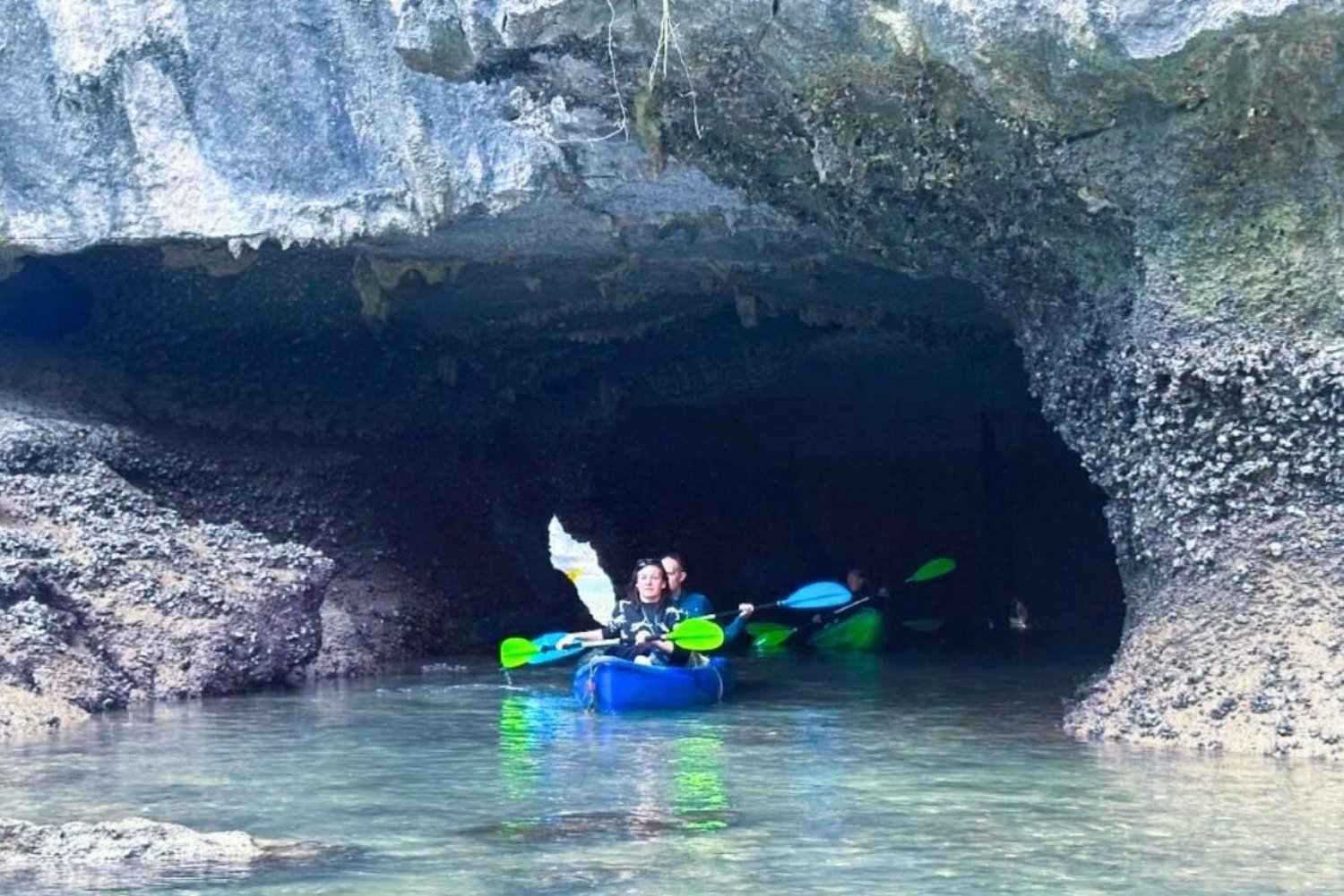 14:30: Zwiedzanie dziewiczej laguny zatoki Lan Ha na kajakach. Pływanie kajakiem przez jaskinie Dark i Bright, naturalne tunele i majestatyczne łuki skalne. Obszar ten jest zarówno zachwycający, jak i chroniony ekologicznie.