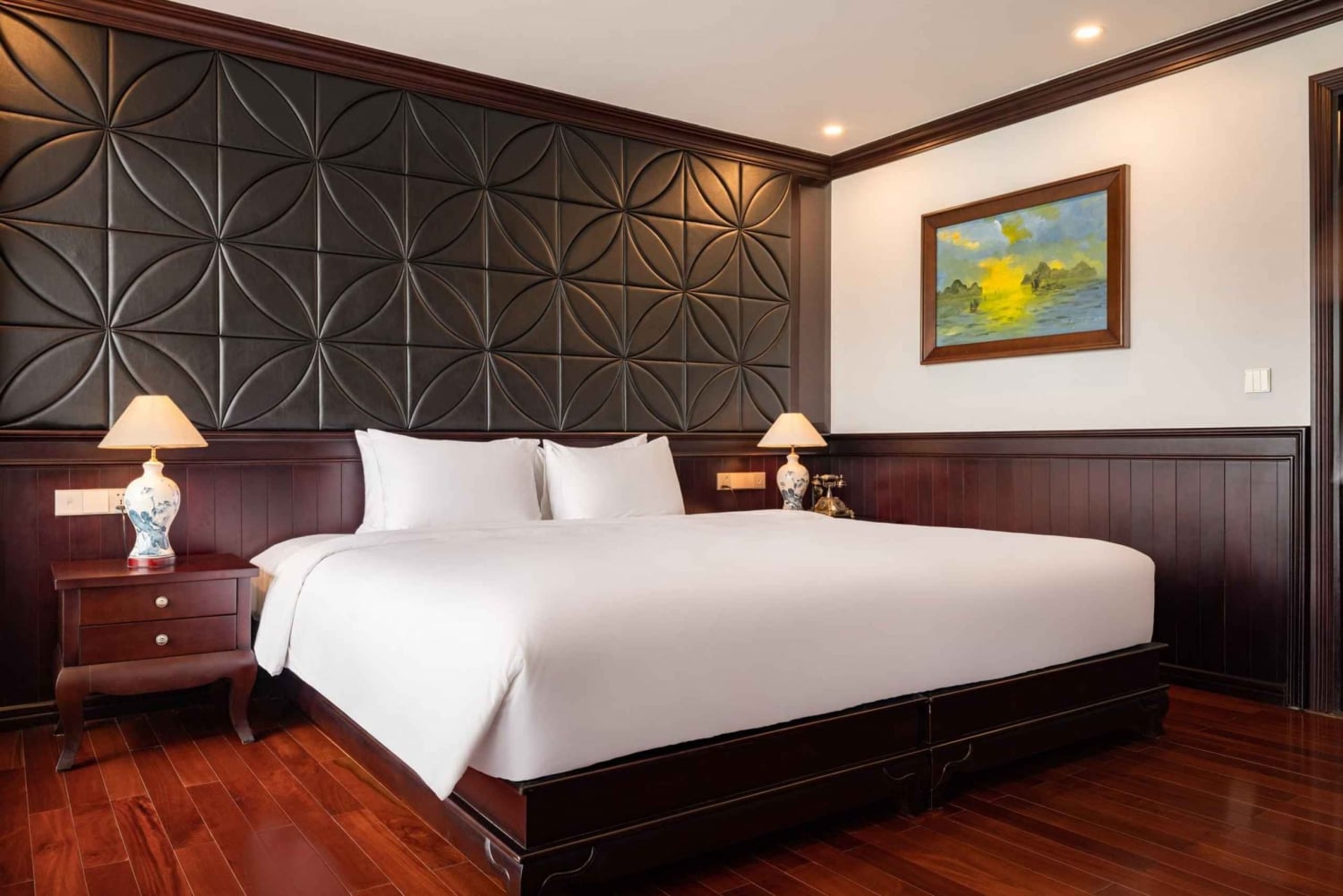 - 12.30: Zamelduj się na CRUISES. Wypłyniemy i zjesz lunch w luksusowej restauracji CRUISES, podziwiając piękno kanałów w drodze do Zatoki Halong.