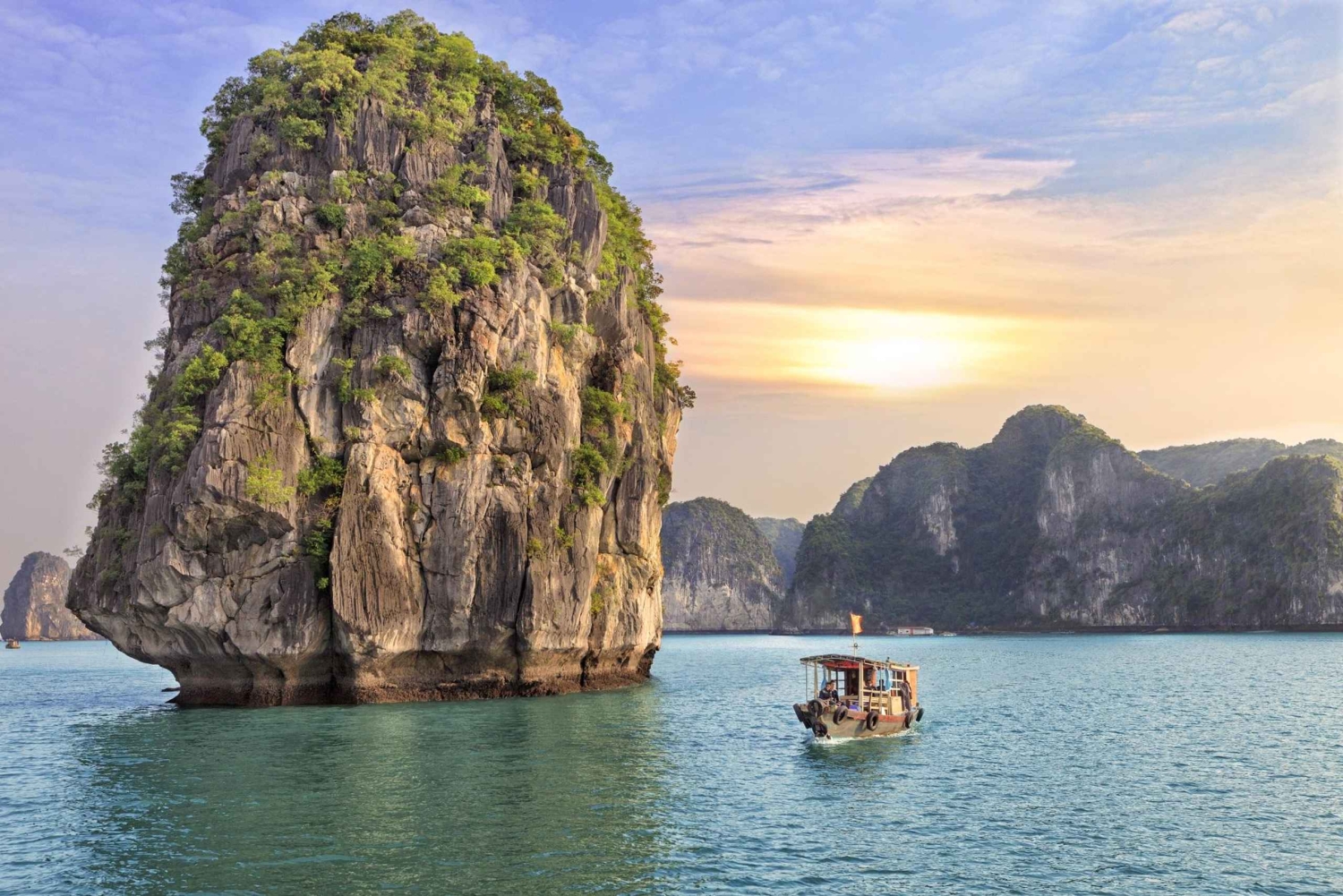 Po przybyciu do portu Tuan Chau zobaczysz strumień czystej, błękitnej wody wraz ze słoniowymi górami wznoszącymi się nad wodą. Odkryjesz piękno zatoki Ha Long. Po drodze możesz odwiedzić najpiękniejsze miejsca w zatoce Ha Long i podziwiać majestat tysięcy dużych i małych wapiennych wysp. Odwiedzisz jedno z najbardziej znanych miejsc w zatoce Ha Long - miejsce, które symbolizuje stabilność i wierność miłości. Odwiedzisz Hon Trong Mai - 'symbol Zatoki Ha Long'. Jest to rozpoznawalna wysepka, która ma postać dwóch kurczaków: koguta i kury, o których mówi się, że się całują. to najlepsze miejsce dla pary. Ta wyspa wraz z piękną przyrodą w Ha Long sprawi, że miłość pary będzie coraz głębsza.