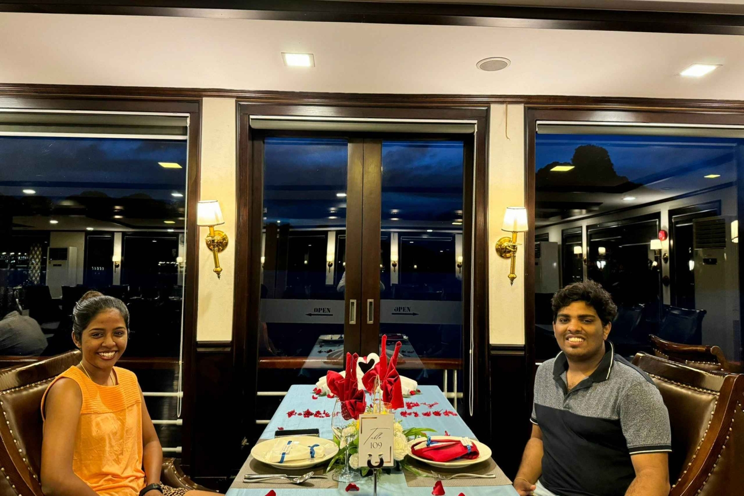12:30 – 12:45: Podamy Ci powitalnego drinka i zimny/ciepły ręcznik. Następnie odbędzie się odprawa dotycząca rejsu, podczas której otrzymasz również instrukcje bezpieczeństwa, zanim udasz się do swojej kabiny. Wyruszamy w rejs, a Ty zjesz lunch w naszej luksusowej restauracji, podziwiając piękno kanałów w drodze do zatoki.