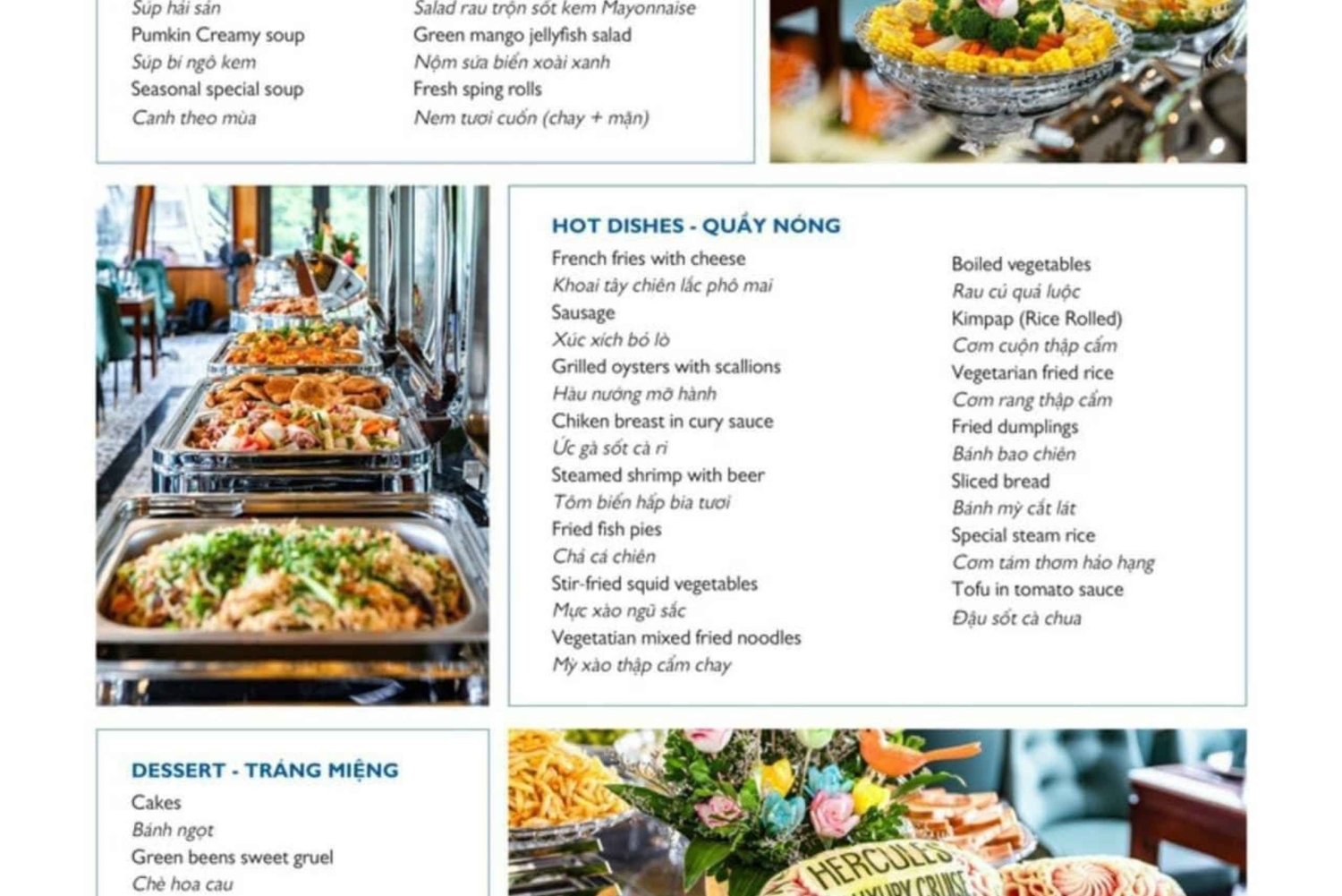 12:30 Ciesz się lunchem w formie bufetu z tradycyjnymi wietnamskimi potrawami podczas rejsu przez tysiące wapiennych wysp, takich jak: Dog Rock, Insence Bunner, a zwłaszcza Fighting Cock - symbol zatoki Ha Long.