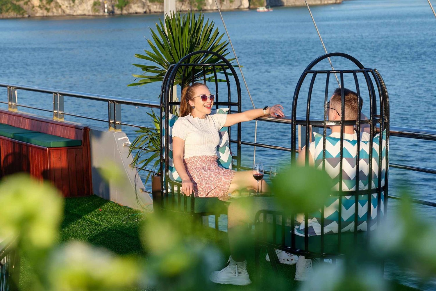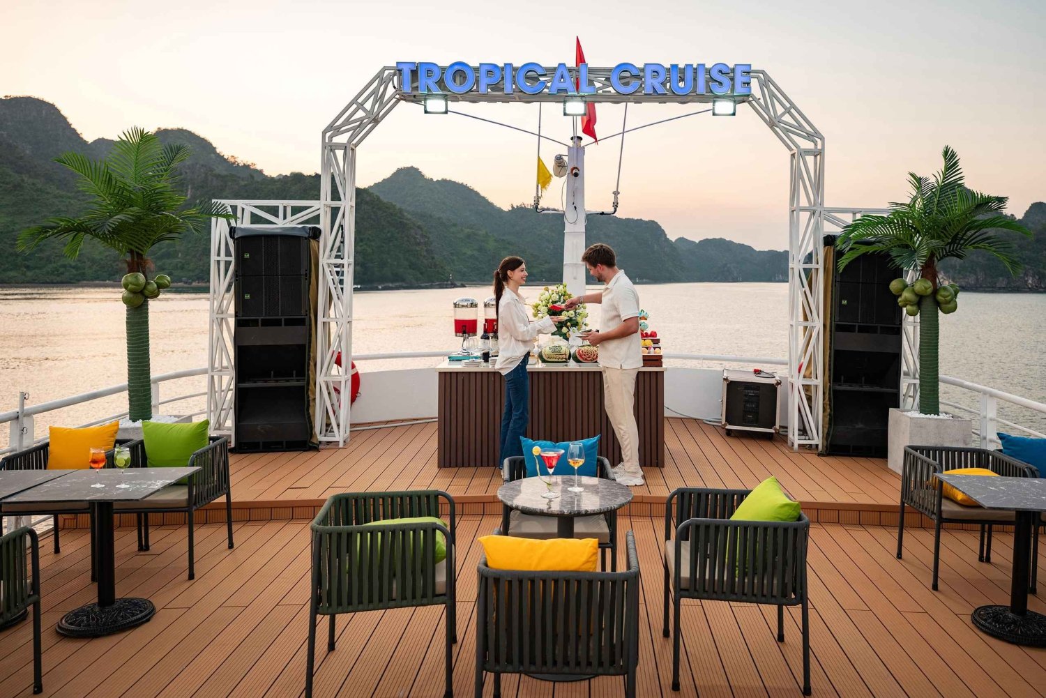 Zakończ dzień na imprezie o zachodzie słońca: wino, herbata, świeże owoce, słodkie ciasta, muzyka i taniec, gdy słońce romantycznie zachodzi nad zatoką Lan Ha, a statek wraca do portu.