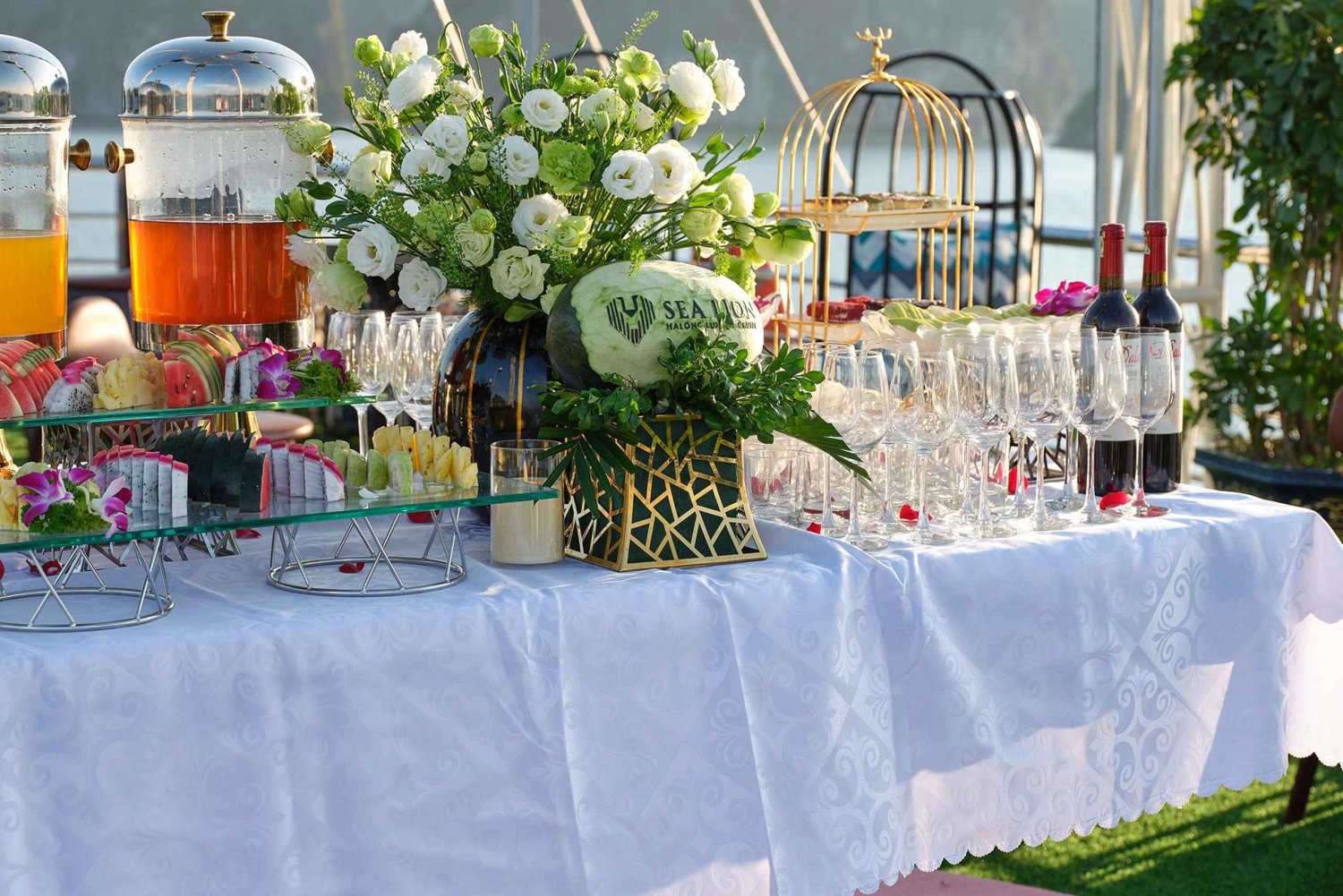Ciesz się 5-gwiazdkowym lunchem w formie bufetu na pokładzie, oferującym szeroki wybór świeżych owoców morza i przysmaków, podczas gdy statek płynie przez zatokę Lan Ha – wyspę Cat Ba.