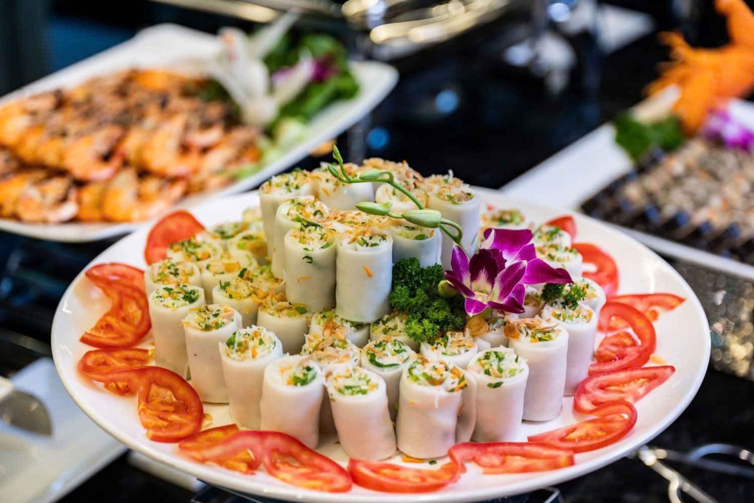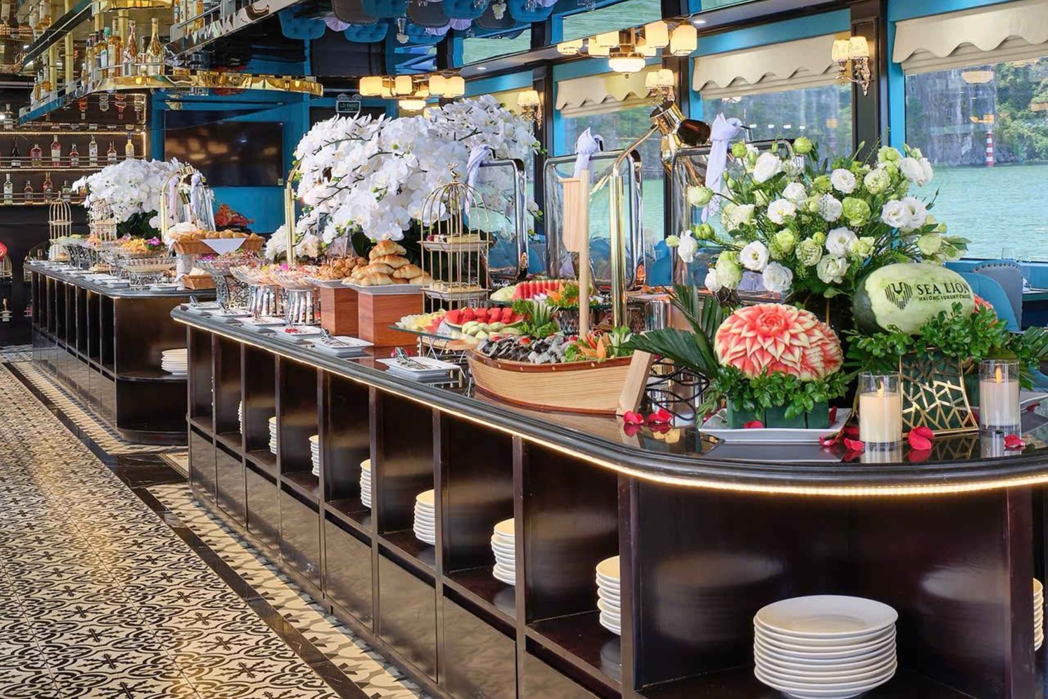 12:30: Ciesz się specjalnym lunchem z ponad 30 potrawami na łodzi. Podczas lunchu łódź będzie mijać piękne krajobrazy po obu stronach z tysiącami wapieni, takich jak Fighting Chicken i Incense Buner Islets - 2 symbole Zatoki Halong.