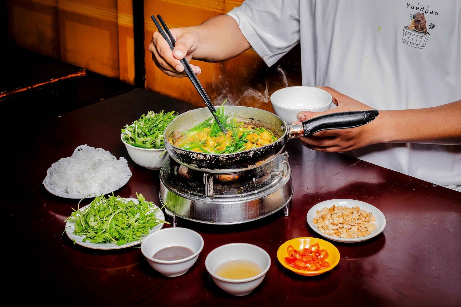 Następnie rolki ryżowe bánh cuon są fachowo zwijane na patelni, a później grillowane kotlety wieprzowe bun cha są polewane na makaron vermicelli i świeże zioła, podczas gdy młode zielone płatki ryżu są pakowane na liście bananowca, popijane sokiem z dracontomelonu. Czeka na Ciebie jeszcze więcej niespodzianek – ponad 15 degustacji podczas 7–8 przystanków naszej ruchomej uczty.