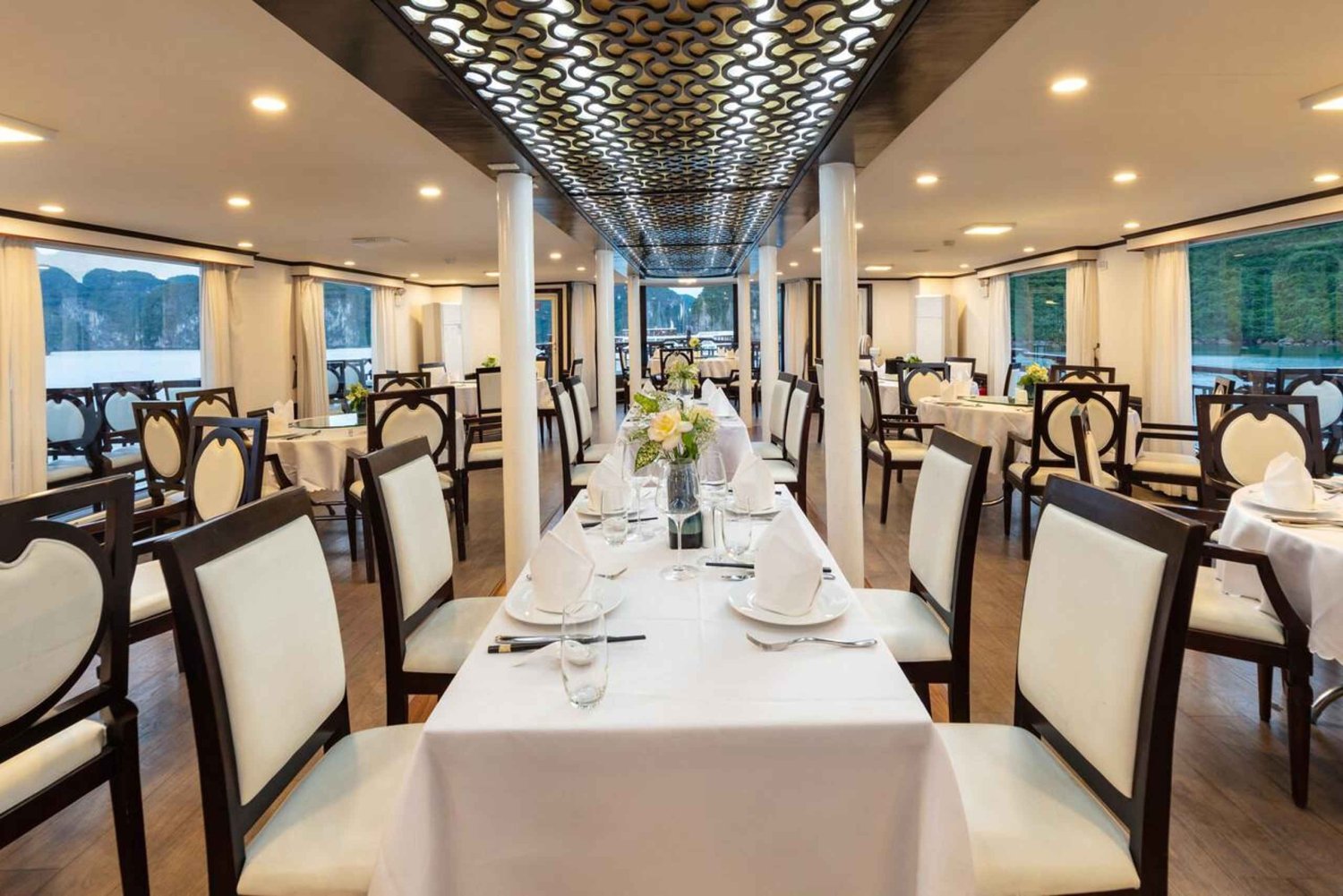 Ciesz się powitalnym drinkiem i zjedz lunch podczas rejsu po zatoce Ha Long. Podziwiaj widoki na wyspę Incense Burner Island, wysepkę Fighting Cock Islet i formację skalną Stone Dog. Rozkoszuj się słońcem na pokładzie lub popłyń kajakiem, aby podziwiać widoki, takie jak Góry Wapienne, Grota Luon i wyspa Titop.