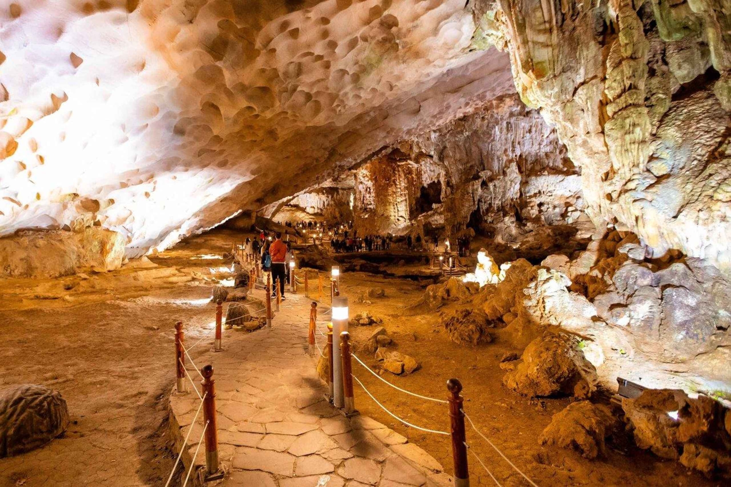 Następnie udasz się do Groty Thien Cung (Grota Niebiańskiego Pałacu), wspaniałej i nieziemskiej jaskini. Poznaj jej ogromne komnaty ozdobione stalaktytami i stalagmitami wszelkiego rodzaju. Największe wrażenie robią cztery święte zwierzęta: smok, jednorożec, żółw i feniks oraz magiczna brama do nieba.
