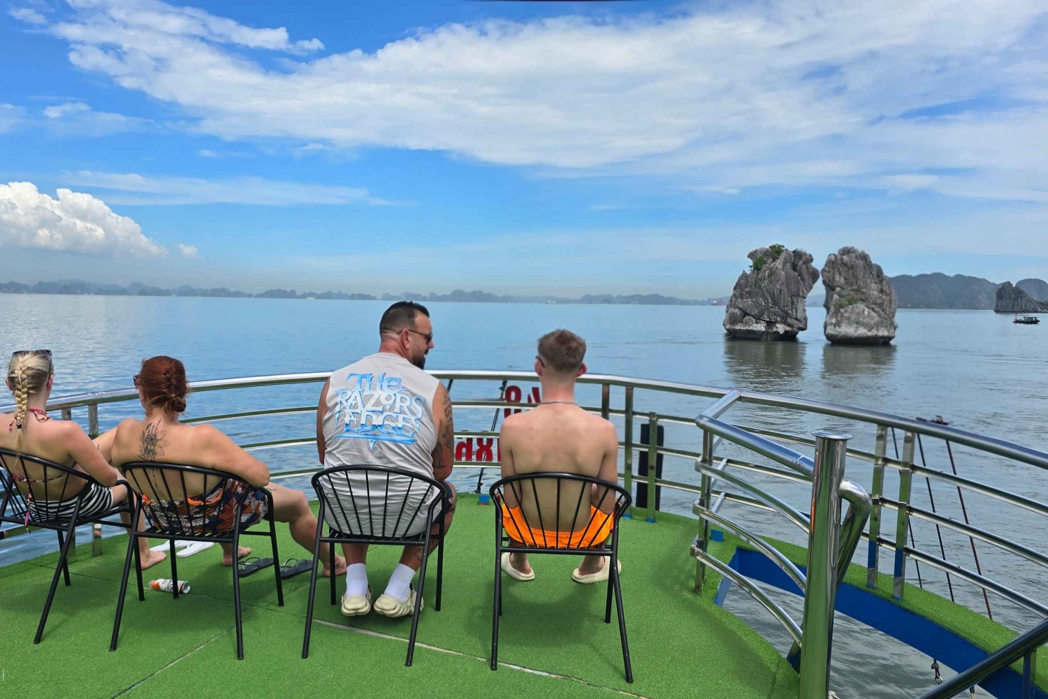 Przybij do nabrzeża turystycznego Halong. Nasz zespół rejsowy wejdzie na pokład i zabierze Cię do zatoki. W drodze powrotnej serwowany będzie lunch ze świeżych owoców morza (na życzenie dostępna będzie opcja wegetariańska).