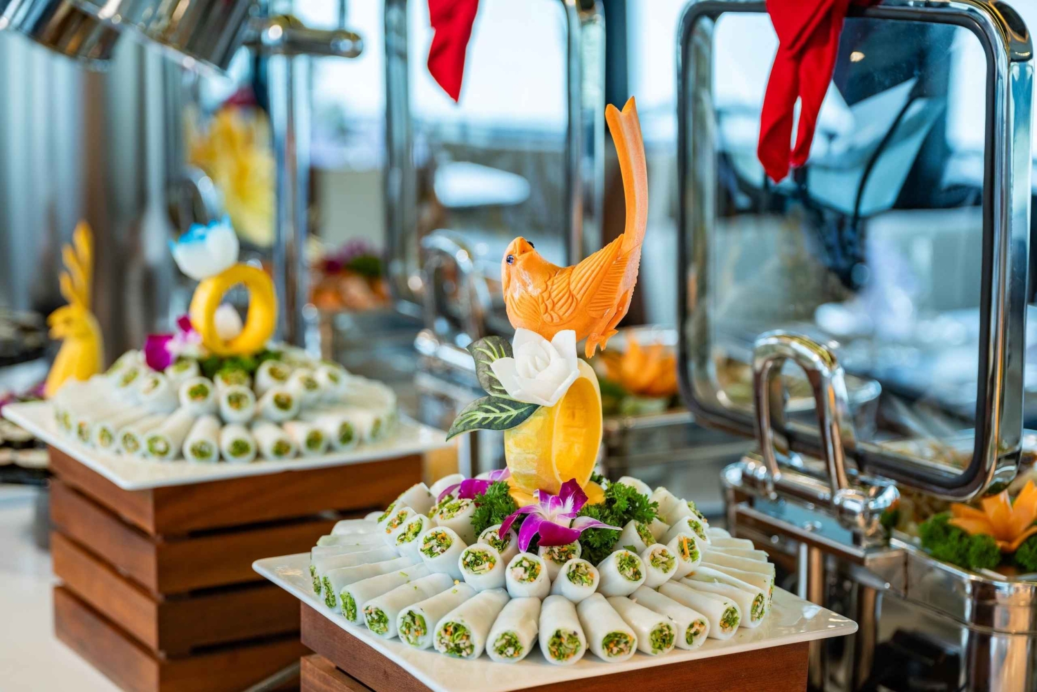 W drodze powrotnej do portu Tuan Chau, ciesz się przyjęciem o zachodzie słońca z herbatą, winem, ciastkami, chipsami z krewetek i świeżymi owocami. Kąp się w blasku zachodzącego słońca na górnym pokładzie, słuchając muzyki. Po powrocie na ląd czeka Cię transport do miejsca odbioru z 20–30-minutową przerwą.